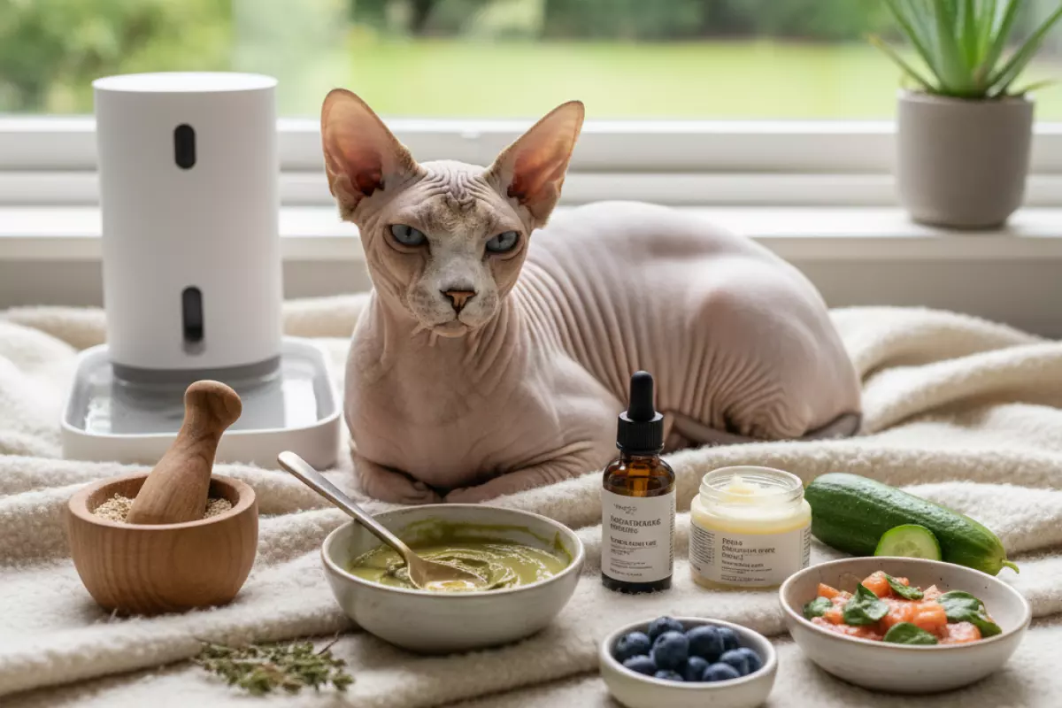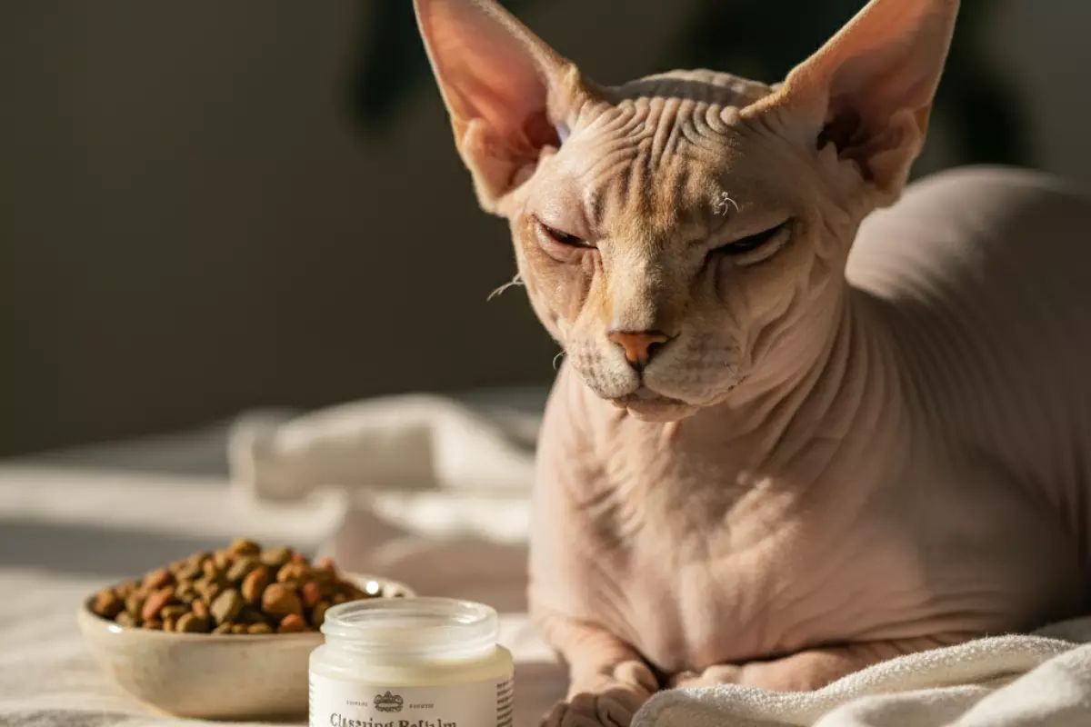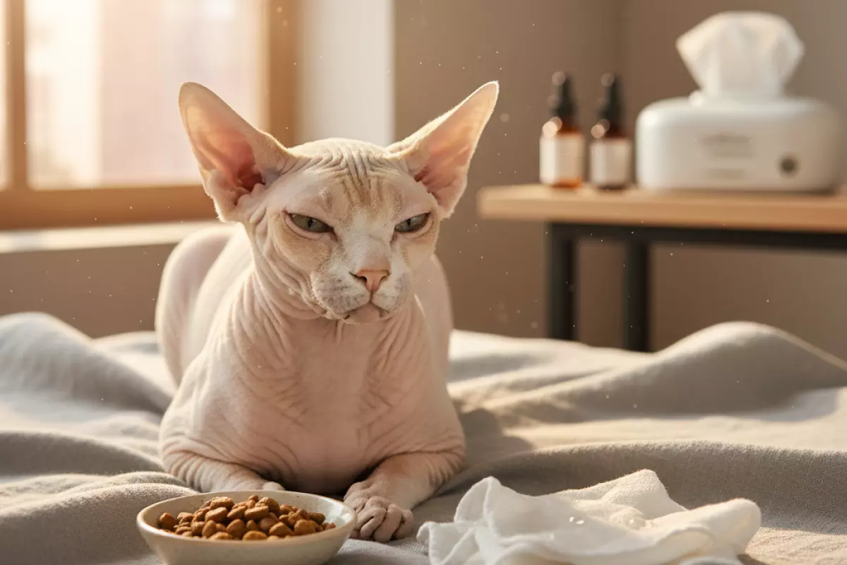 У сфинксов кожа работает «за двоих»: шерсти нет, зато активнее выделяется кожный секрет, быстрее копится грязь в складках и сильнее заметны реакции на питание и уход. Большинство неприятностей проще не лечить, а заранее отлавливать по мелким признакам — запаху, липкости, точечным высыпаниям, изменению цвета.