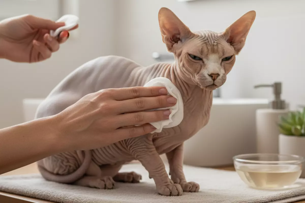У сфинксов нет шерсти, поэтому кожное сало и пот остаются на поверхности: появляются липкость, тёмные следы на подстилке и забитые поры. Задача домашнего ухода — мягко убирать излишки, не пересушивая и не «сдирая» защитный слой.