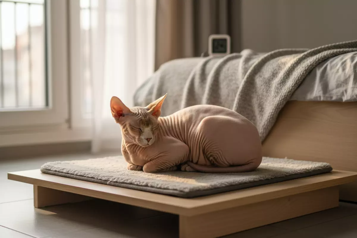 Сфинкс быстро остывает: у него нет шерсти, а кожа активно отдает тепло. Поэтому в быту важнее всего держать стабильный «комфортный коридор» и не допускать сквозняков, особенно после купания или протирания влажными салфетками.