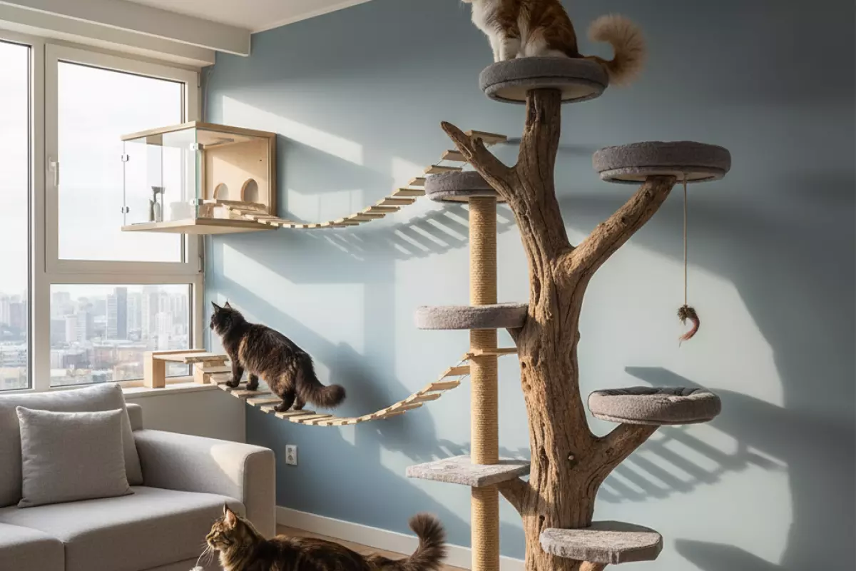 | Места для наблюдения | Коту важно контролировать пространство и отдыхать повыше | Надёжные полки/лежанки, нескользящая поверхность, безопасные крепления |