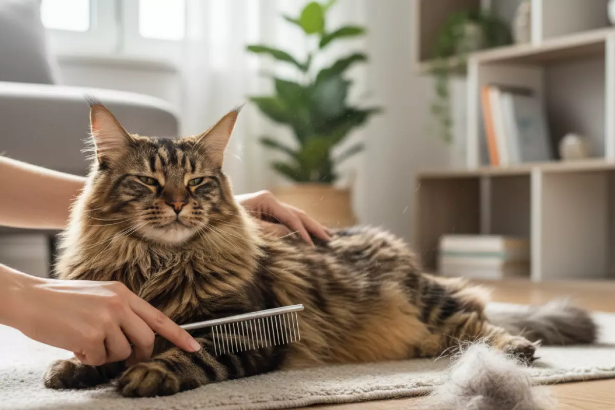 Длинная полудлинная шерсть мейн-куна в квартире быстро собирает пыль и «скатывается» в проблемных местах: за ушами, в «подмышках», на животе и в зоне штанишек. Регулярное вычёсывание решает сразу две задачи: меньше шерсти по дому и меньше риска колтунов, которые потом приходится выстригать.