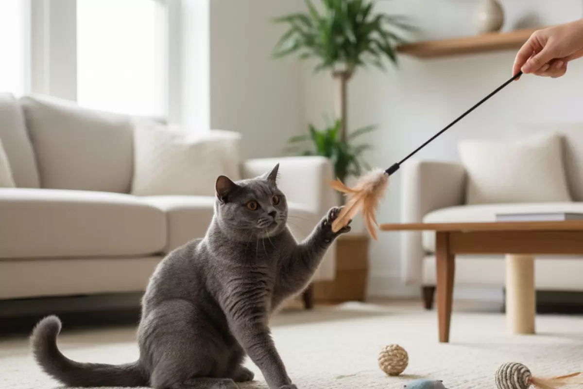 Британцы обычно не устраивают марафоны по потолку, но это не значит, что им достаточно «полежать и поесть». Без коротких, регулярных занятий кошка быстрее набирает вес, скучает и может переключиться на «саморазвлечения» вроде ночных забегов или охоты на ноги.