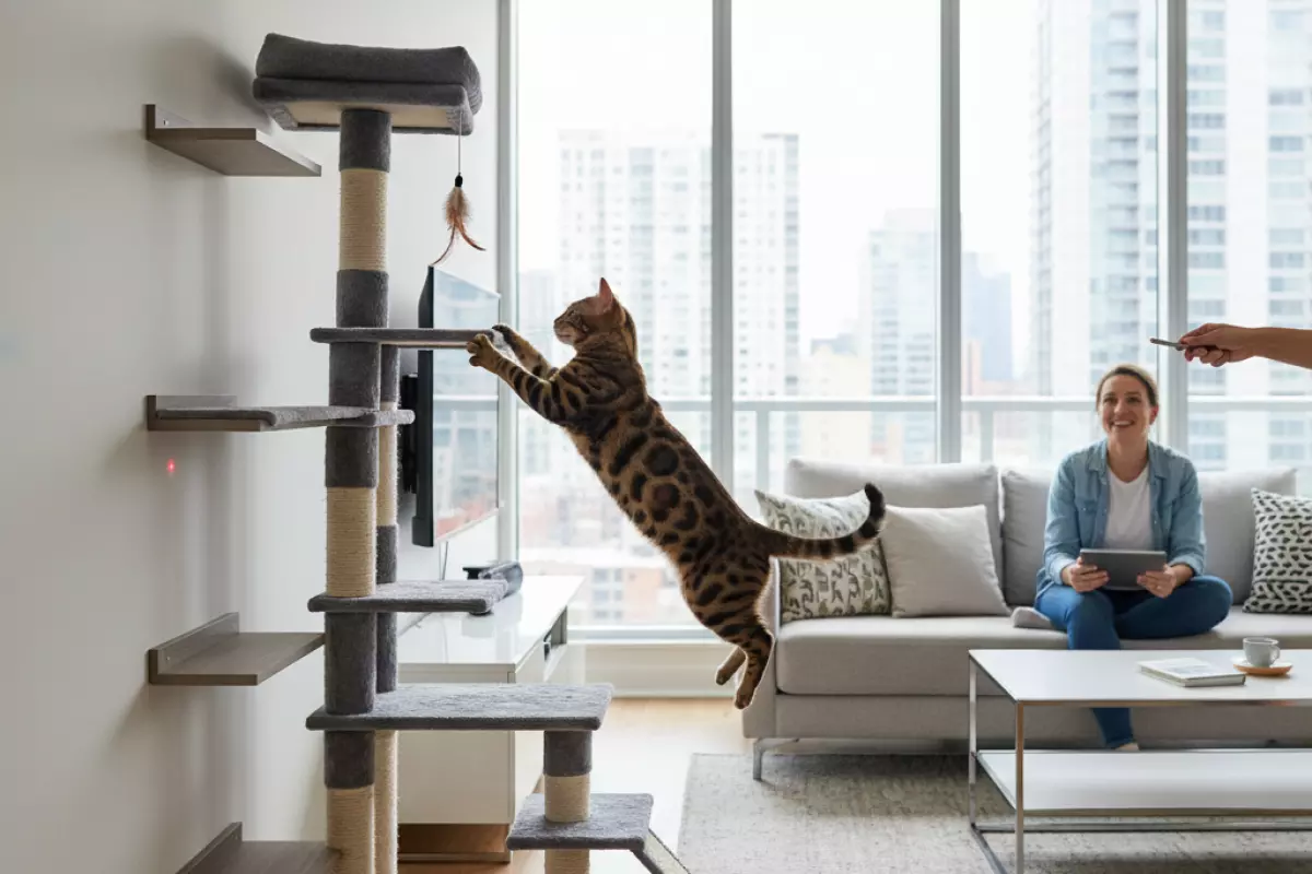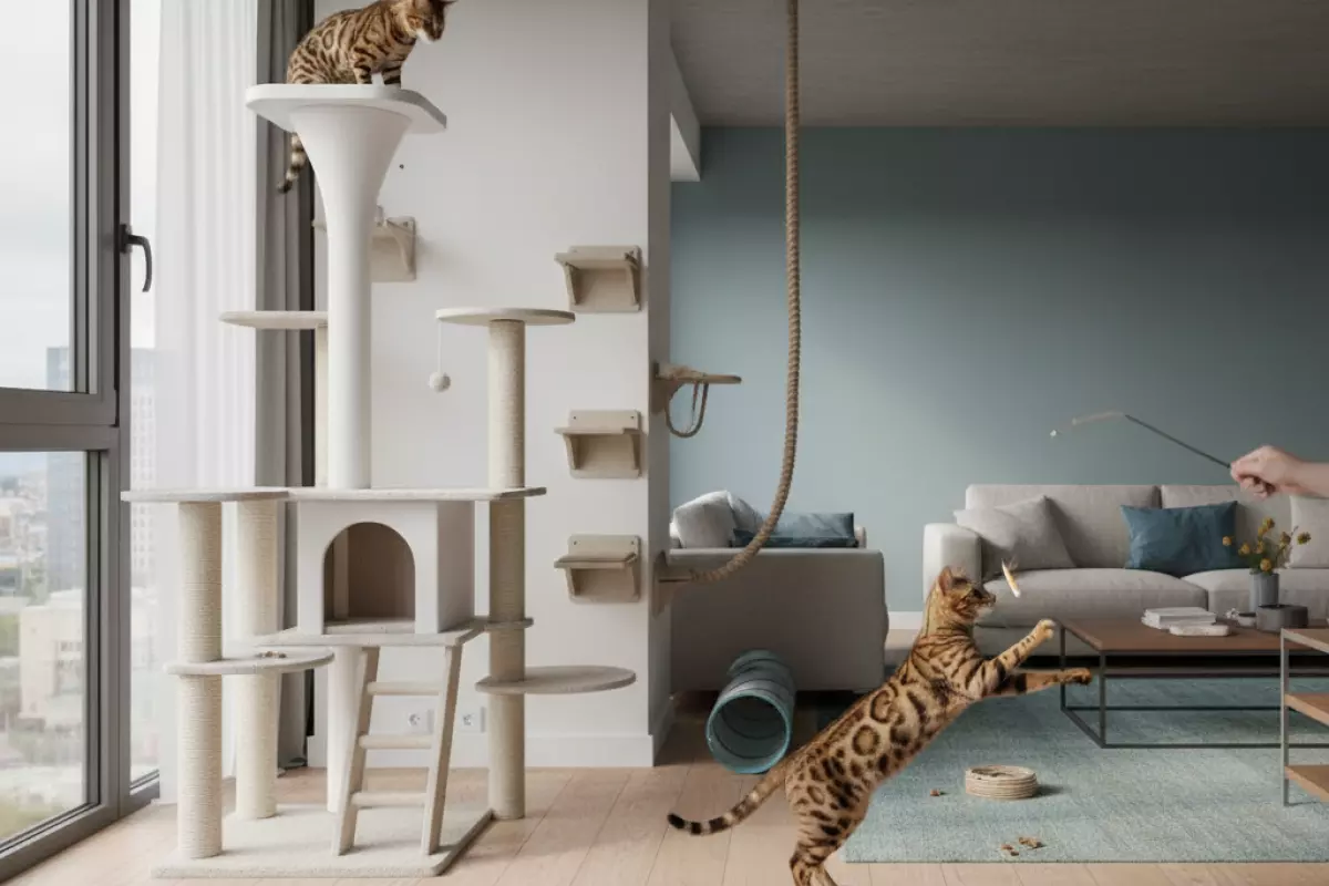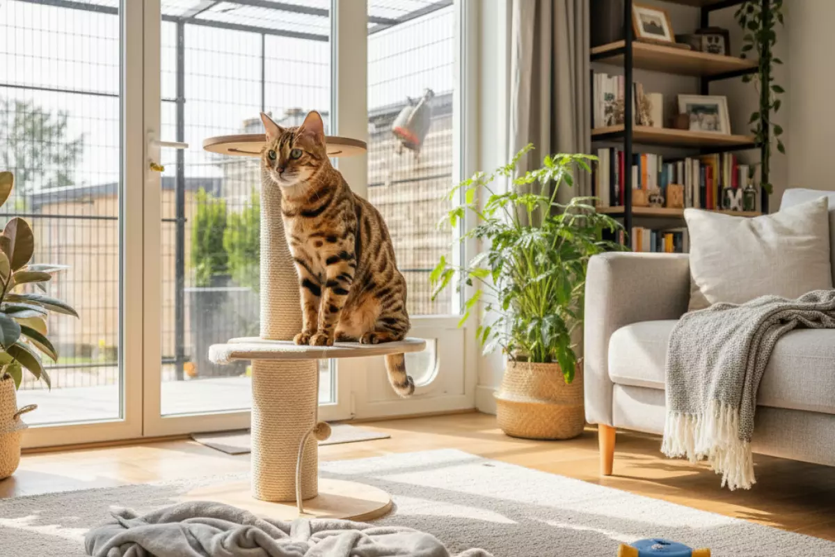 Опора на высоту — важная часть нагрузки: прыжки и лазание дают бенгалу больше, чем бесконечное беганье по полу. Минимальный набор — устойчивый высокий комплекс, когтеточка и несколько точек наблюдения.