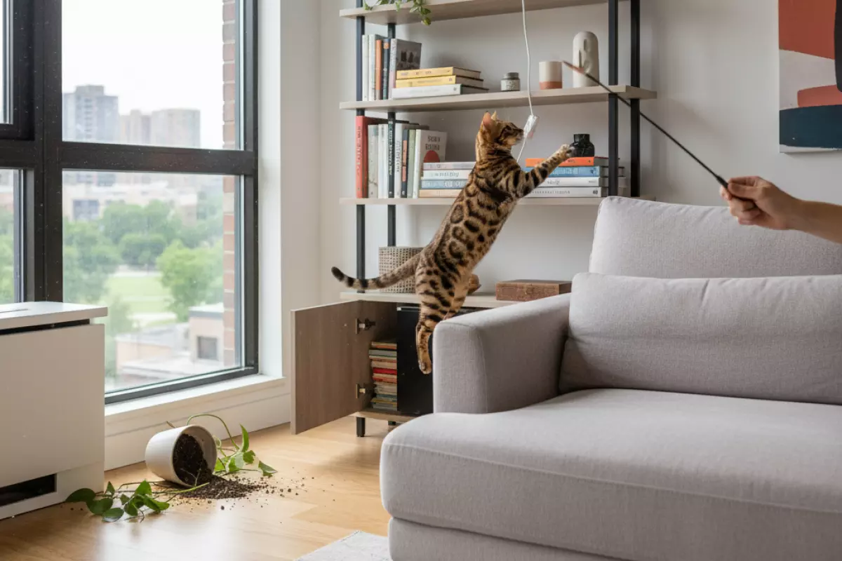 Бенгал часто «разносит» квартиру не из вредности, а потому что ему скучно, тесно и нечем заняться. Чем больше у кошки легальных способов бегать, прыгать, лазать и «охотиться», тем меньше шансов, что пострадают шторы, провода и полки.