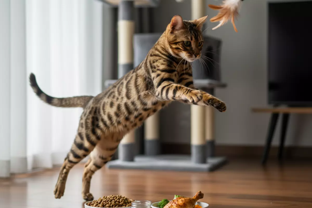 Бенгалу мало «просто побегать по квартире»: ему нужны короткие, но регулярные занятия, где есть охота, прыжки, лазание и задачки на голову. Если энергии не давать выход, кошка быстро находит его сама — на шторах, полках и в ночных забегах.