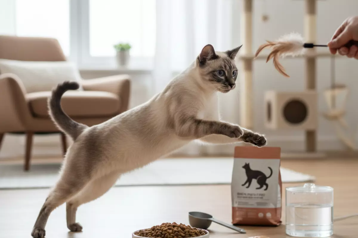 Сиамы тратят много энергии: они подвижные, любопытные и часто «включаются» в игру по первому шороху. Поэтому рацион лучше подбирать так, чтобы кошка получала достаточно белка и калорий, но без перекорма: у этой породы аппетит нередко «обгоняет» реальную потребность.