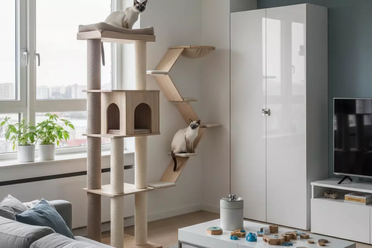 | Гостиная | Высокий комплекс, настенные полки, лежанка на высоте | Дает вертикальную активность и точку наблюдения | Низкая когтеточка «для галочки»; шаткая конструкция |