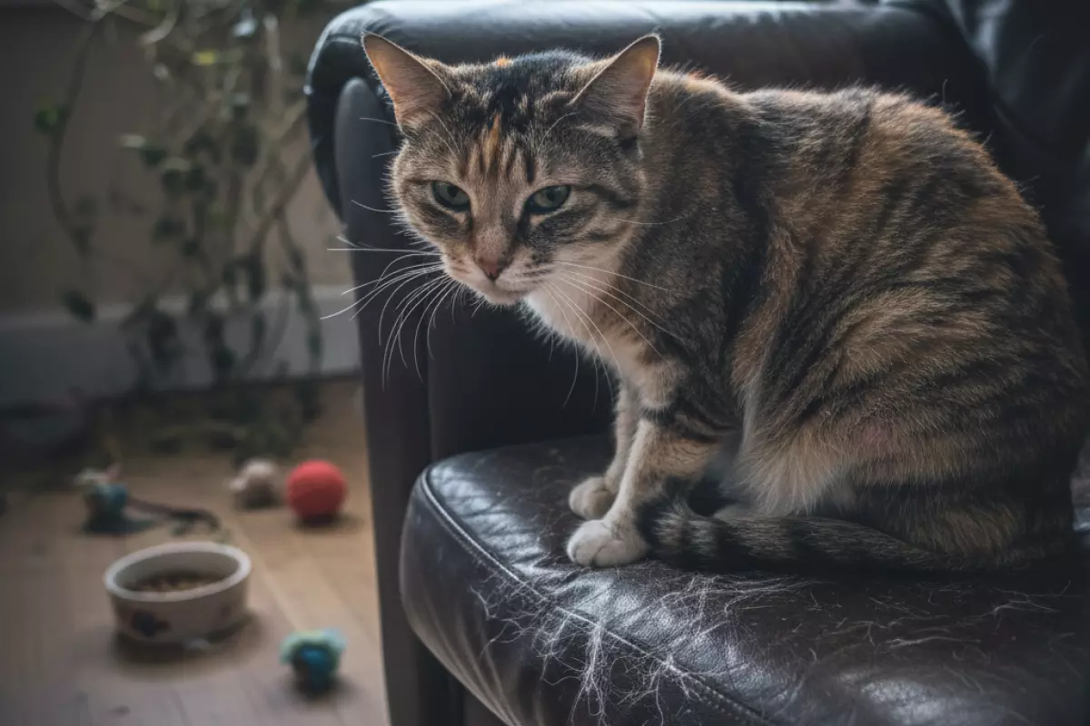 Нервная нагрузка у кошек часто выглядит «тихо»: питомец может просто больше вылизываться, прятаться или стать раздражительным. Из-за постоянного вылизывания шерсть ломается, появляются участки поредения, а подшёрсток быстрее «вылетает» по дому.