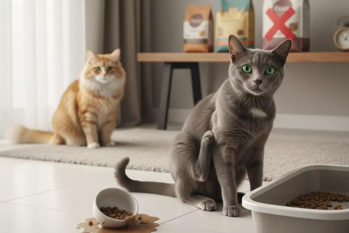 Если вы меняли питание резко, эти симптомы могут быть реакцией на переход. Но если улучшения нет в течение 7–10 дней при плавной замене, состав, размер гранул или жирность могут быть неудачными именно для вашей кошки.
