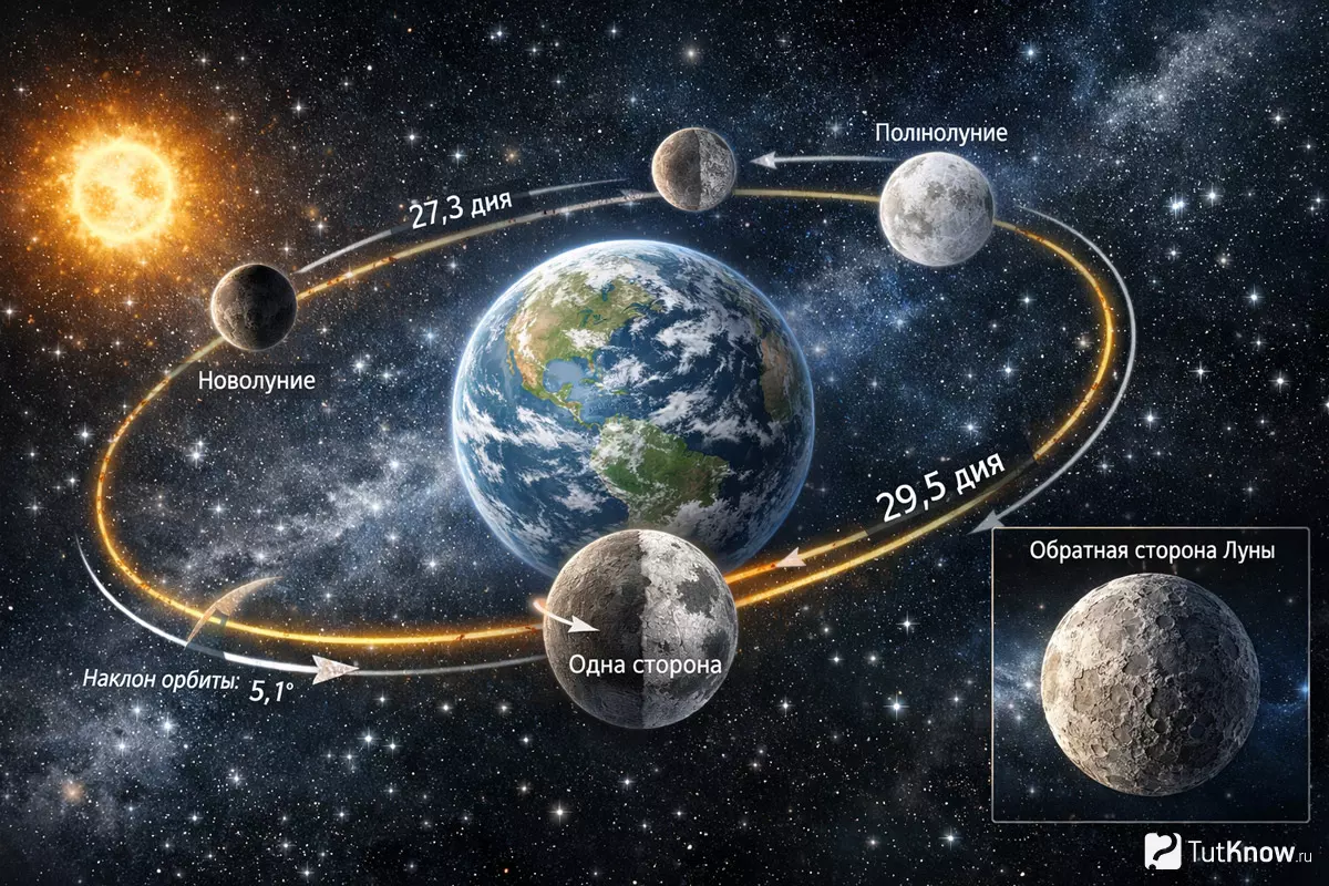 Лунная орбита представляет собой почти идеальный круг, по которому спутник движется примерно за 27,3 дня относительно звёздного неба. Однако, если считать относительно Солнца, цикл длится около 29,5 суток — это связано с тем, что за это время Земля сама смещается по орбите вокруг светила. В процессе движения спутник не просто обходит нашу планету, но и синхронизированно вращается вокруг своей оси, что и приводит к тому, что одна и та же поверхность Луны всегда обращена к нам.