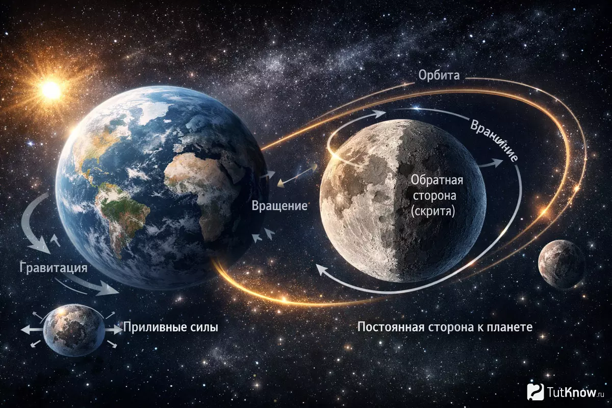 Этот эффект возникает из-за гравитационного взаимодействия между телами. Со временем приливные силы выравнивают вращение так, что спутник оказывается «привязан» одной стороной к своему центру притяжения. В случае Луны мы видим только её «лицо», а обратная сторона остаётся скрытой.