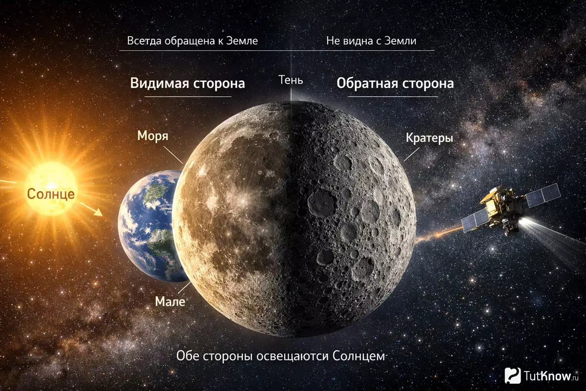 Иллюзия постоянной тьмы связана с тем, что мы видим только одну сторону. На самом деле, обе половины получают одинаковое количество солнечного света. Различие лишь в том, что наблюдать за «оборотной» частью с Земли невозможно без помощи космических аппаратов.
