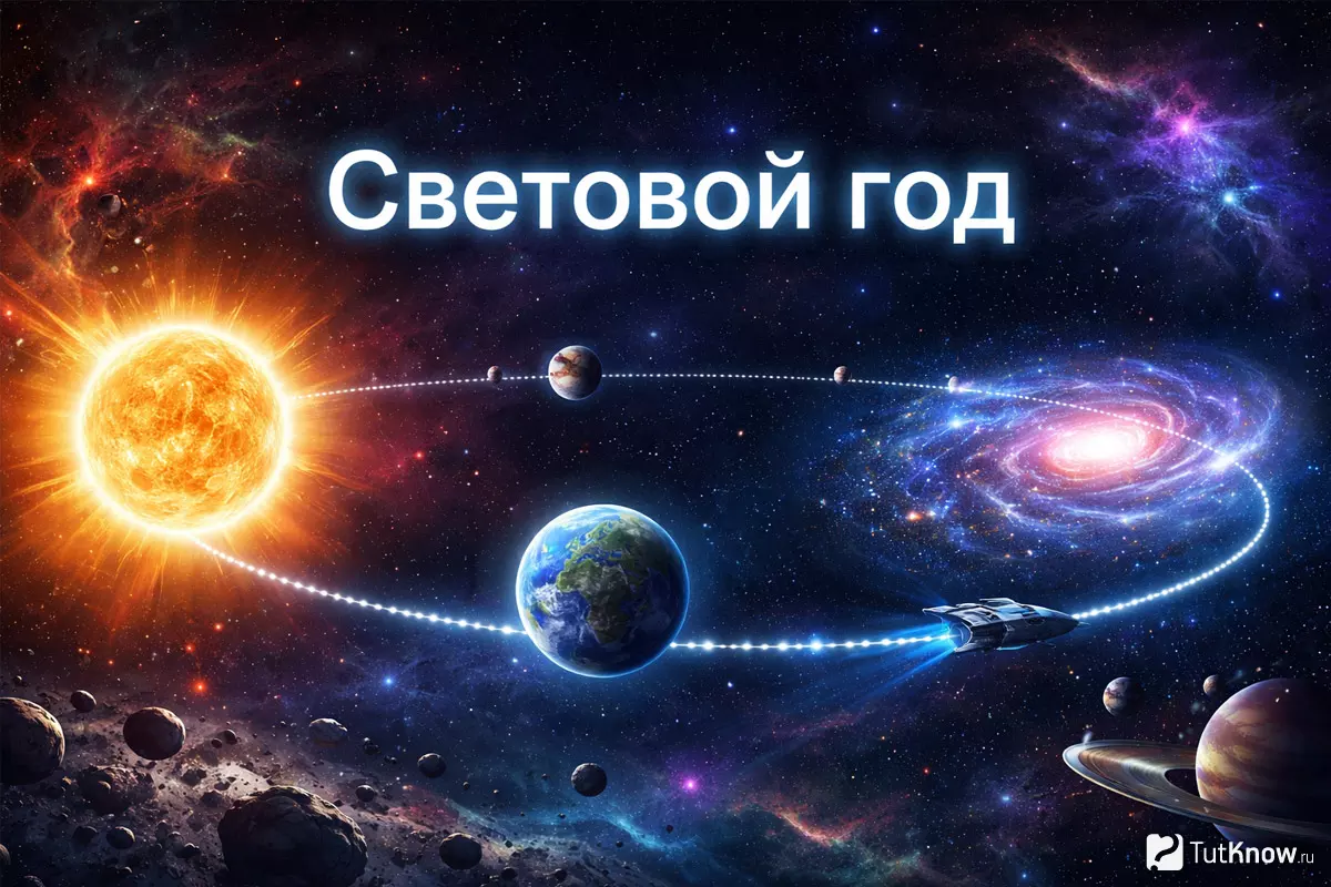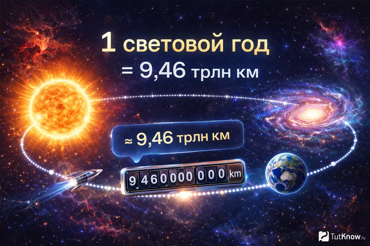 Световой год — это расстояние, которое свет проходит за один год, двигаясь со скоростью света в вакууме. В цифрах это примерно: