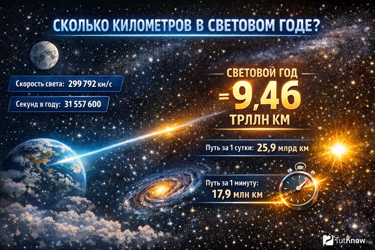 Чтобы узнать полный путь, который свет проходит за год, нужно умножить скорость света на количество секунд в году (365,25 суток × 24 часа × 60 минут × 60 секунд). В результате получается около 9,46 триллиона километров (9 460 730 472 580,8 км).