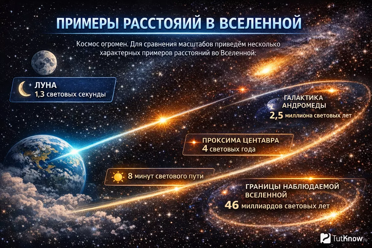 Чтобы представить себе масштабы космоса, полезно сравнить различные дистанции между объектами. Световой год — это удобная единица измерения, которая позволяет оценить, насколько далеко расположены звезды, галактики и другие астрономические объекты. Приведём несколько характерных примеров: