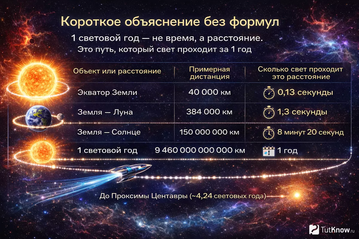 Слово «год» в названии часто сбивает с толку, заставляя думать, что речь о времени. На самом деле, это просто способ удобно выразить колоссальные расстояния, используя привычное всем понятие времени — год. Так астрономы делают числа более понятными, не оперируя миллиардами километров.