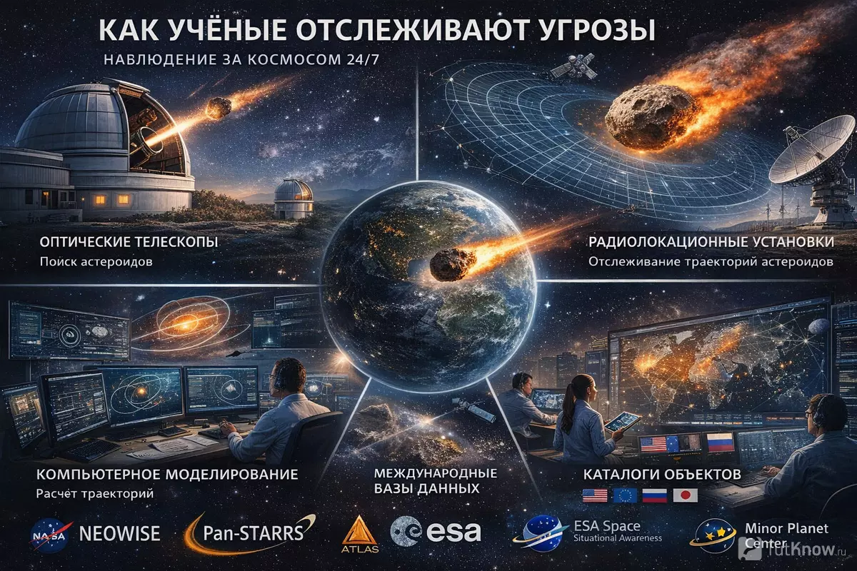 Астрономы по всему миру круглосуточно наблюдают за космосом, чтобы заранее узнать о приближении потенциально опасных объектов. Для этого используются специализированные телескопы, автоматические камеры слежения и сложные компьютерные алгоритмы. Каждый новый объект тщательно анализируется: ученые определяют его траекторию, скорость и размеры, чтобы рассчитать вероятность столкновения с нашей планетой.