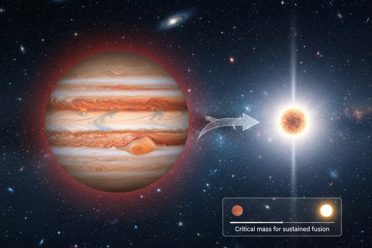 Если бы газовый гигант набрал достаточно массы для устойчивого термоядерного горения, Солнечная система превратилась бы в «двойную»: рядом с Солнцем появился бы второй источник света и тепла. Важно уточнить: при «звёздном» сценарии речь чаще всего идёт не о полноценной звезде, как наше Солнце, а о красном карлике или даже о коричневом карлике (объекте на грани, где реакции идут слабее или недолго).