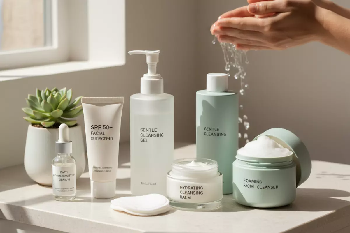 - Мягкое очищение: гель/пенка без «скрипа» + тёплая вода. Пересушивание часто провоцирует раздражение и неровности.