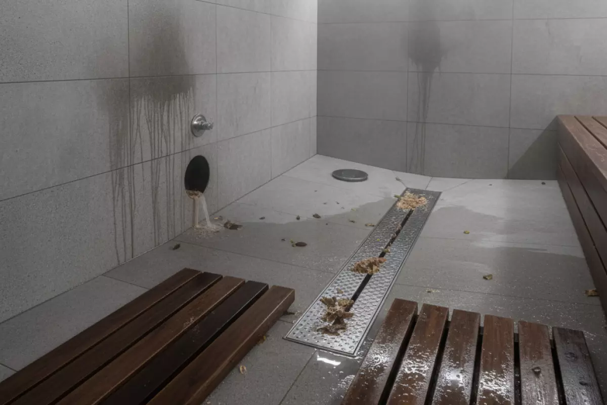 - Слейте воду и уберите лужи. Пройдитесь скребком по полу, выгоните воду в трап/слив, соберите скамьи и настилы от капель.