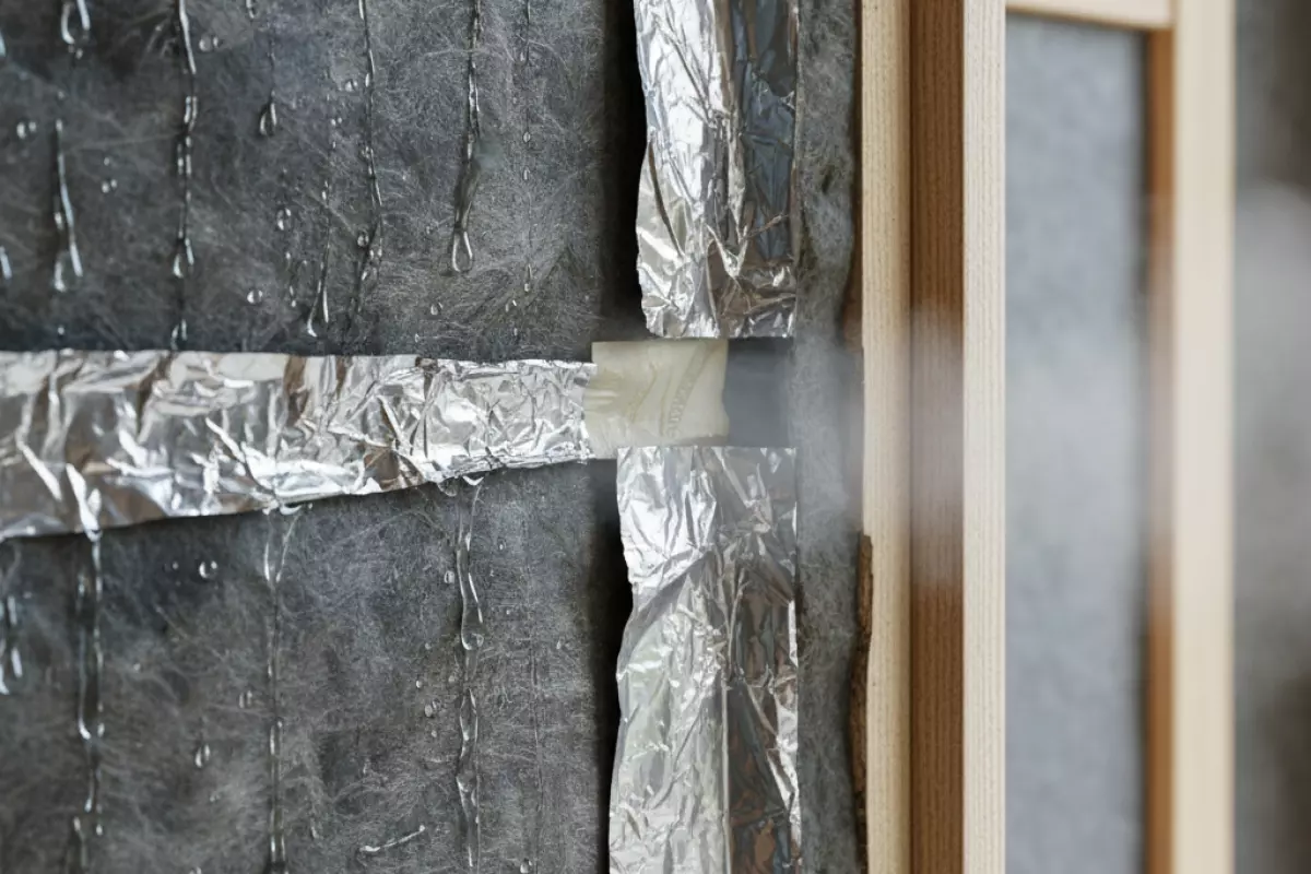 | Нахлёсты не проклеены, много проколов | Пар «струёй» уходит в конструкцию через щели | Локальные мокрые зоны у стыков и углов | Проклейка алюминиевым скотчем, герметизация примыканий, минимум скоб |
