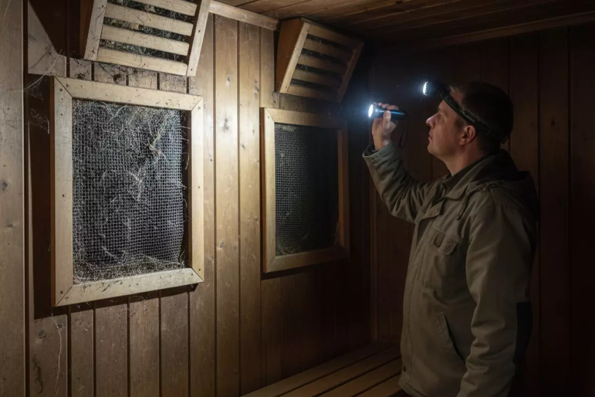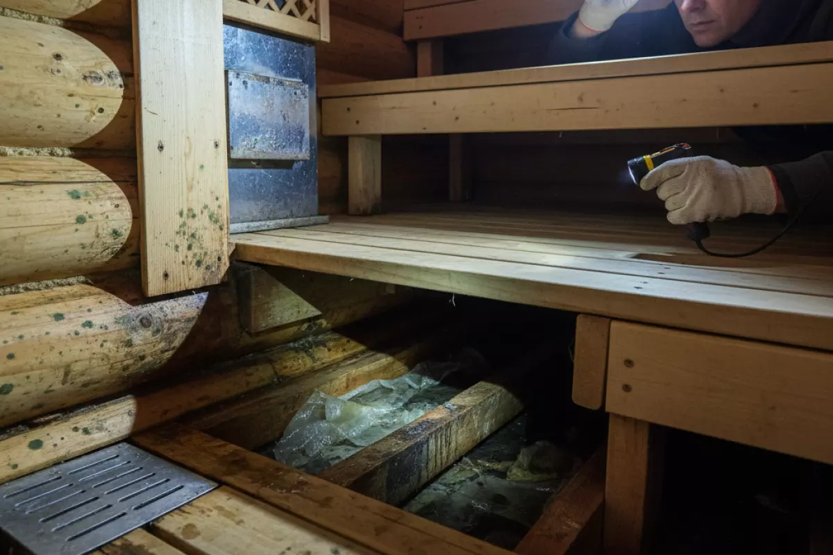 Проверьте места, куда обычно не заглядывают: под полками, за экранами у печи, под настилом пола, в углах возле сливного трапа и в подпольном пространстве. Именно там после весны чаще всего остаются сырость, конденсат и следы плесени. Осмотр лучше делать с ярким фонарём и в перчатках, чтобы сразу заметить потемнения, рыхлую древесину и влажные участки.