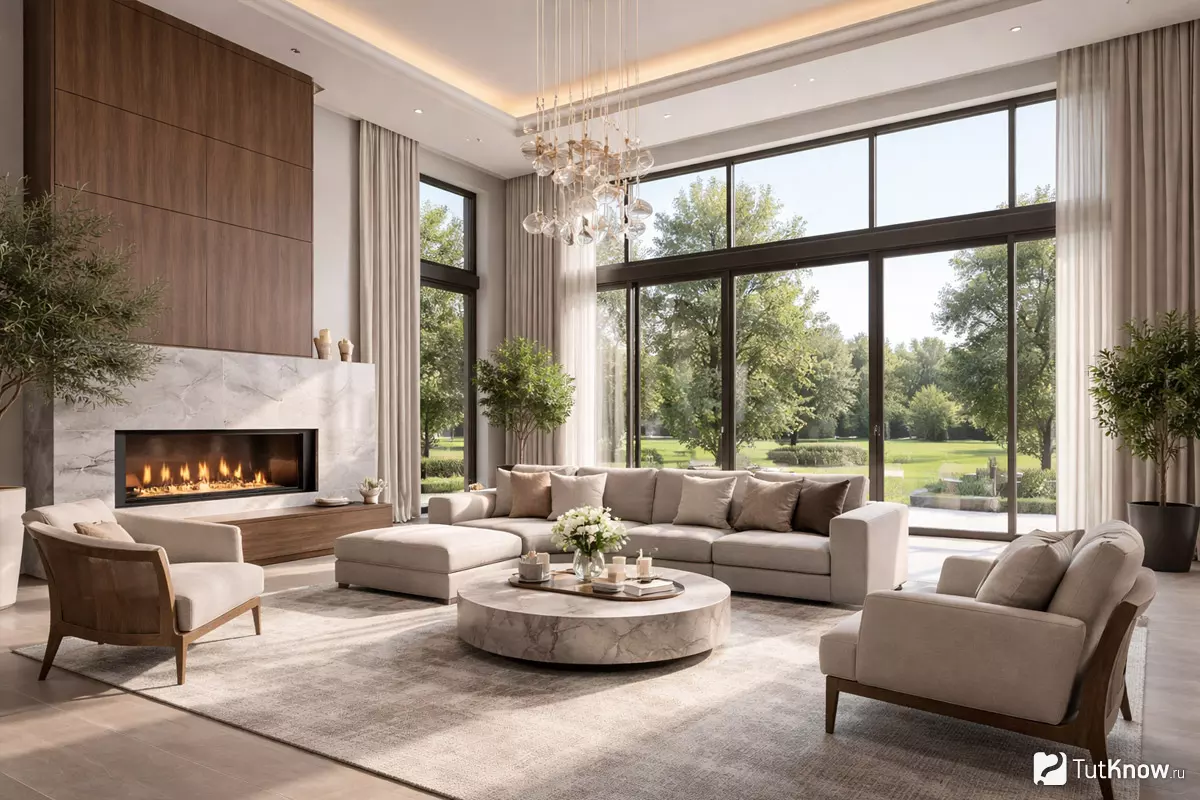 Часто в домах гостиные оснащают панорамными или просто большими окнами. Это не только наполняет комнату естественным светом, но и позволяет любоваться садом или двором. Важно продумать расположение мебели так, чтобы не загораживать проход света и вид за окном.