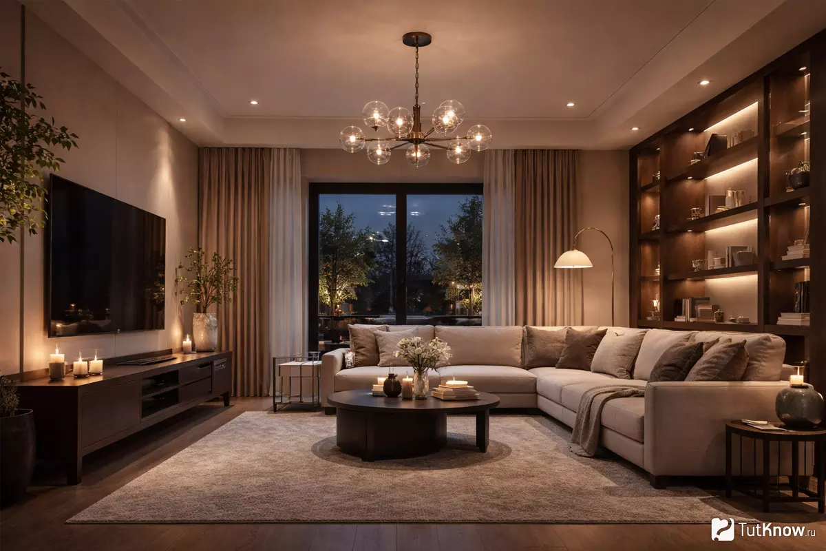Для гармоничного результата важно не только выбрать разные источники, но и грамотно их расположить. Обратите внимание на цветовую температуру ламп: тёплый свет создаёт расслабляющую атмосферу, нейтральный — подходит для активных встреч. Экспериментируйте с комбинациями, чтобы гостиная оставалась удобной и красивой в любое время дня.