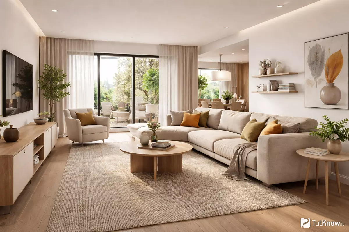 При оформлении гостиной для разных типов жилья часто выбирают спокойные фоны: светло-серый, бежевый, молочный или оттенки белого. Такая база делает помещение визуально просторнее и подходит для любых стилей — от скандинавского до современного минимализма. Классические нейтральные тона легко сочетаются между собой и позволяют менять настроение комнаты с помощью деталей.