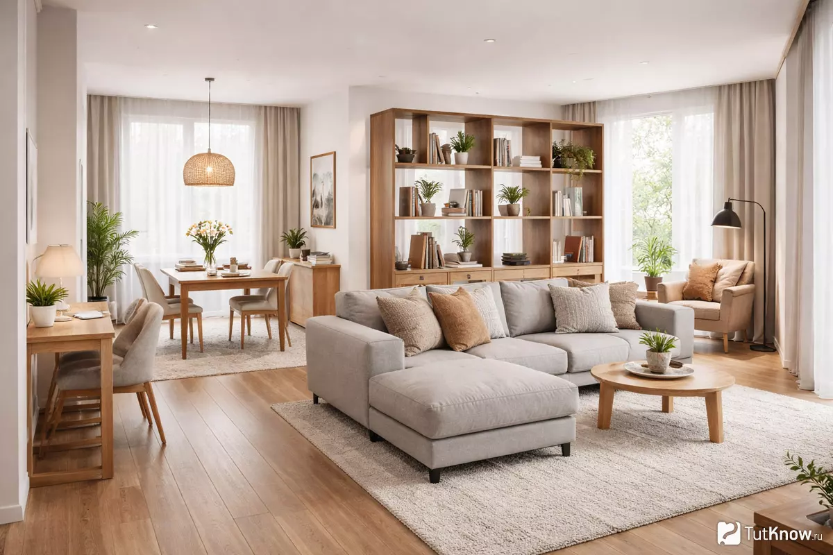 В малогабаритных квартирах лучше выбирать лёгкие и мобильные решения: ширмы, складные перегородки, передвижные стеллажи. Не стоит загромождать комнату — чем проще способ, тем легче менять конфигурацию пространства под текущие задачи. Подход к организации пространства зависит от образа жизни. Для семьи с детьми актуальны мягкие разделители, чтобы сохранить обзор. В студии удобно использовать мебель двойного назначения: диван-кровать или стол-трансформер.