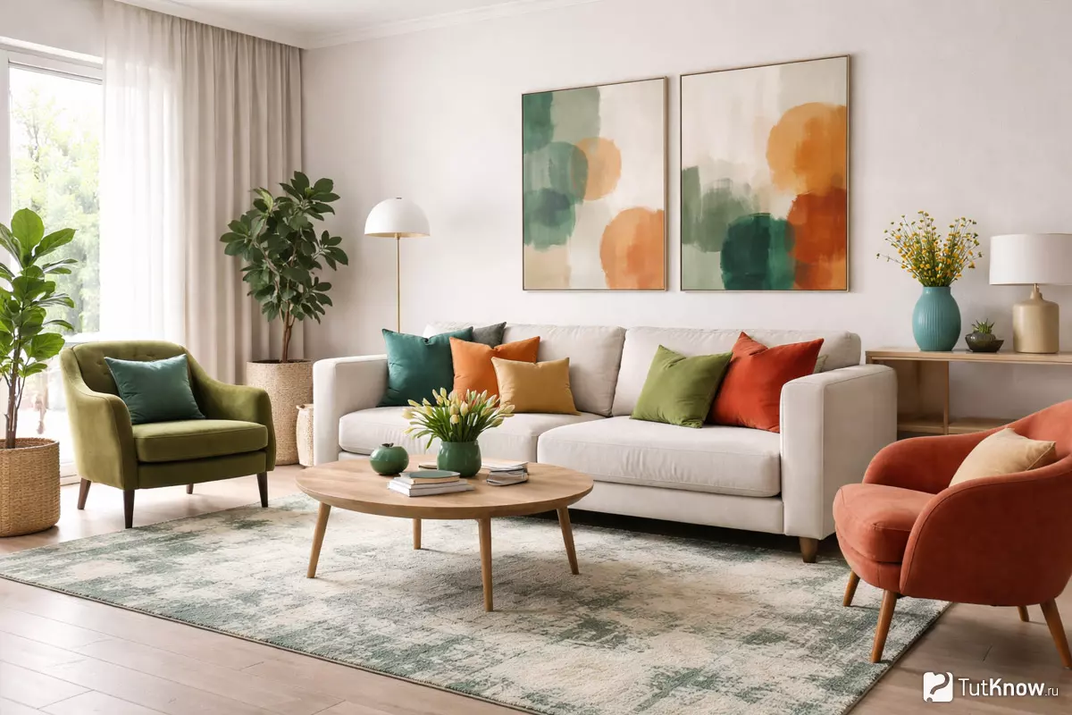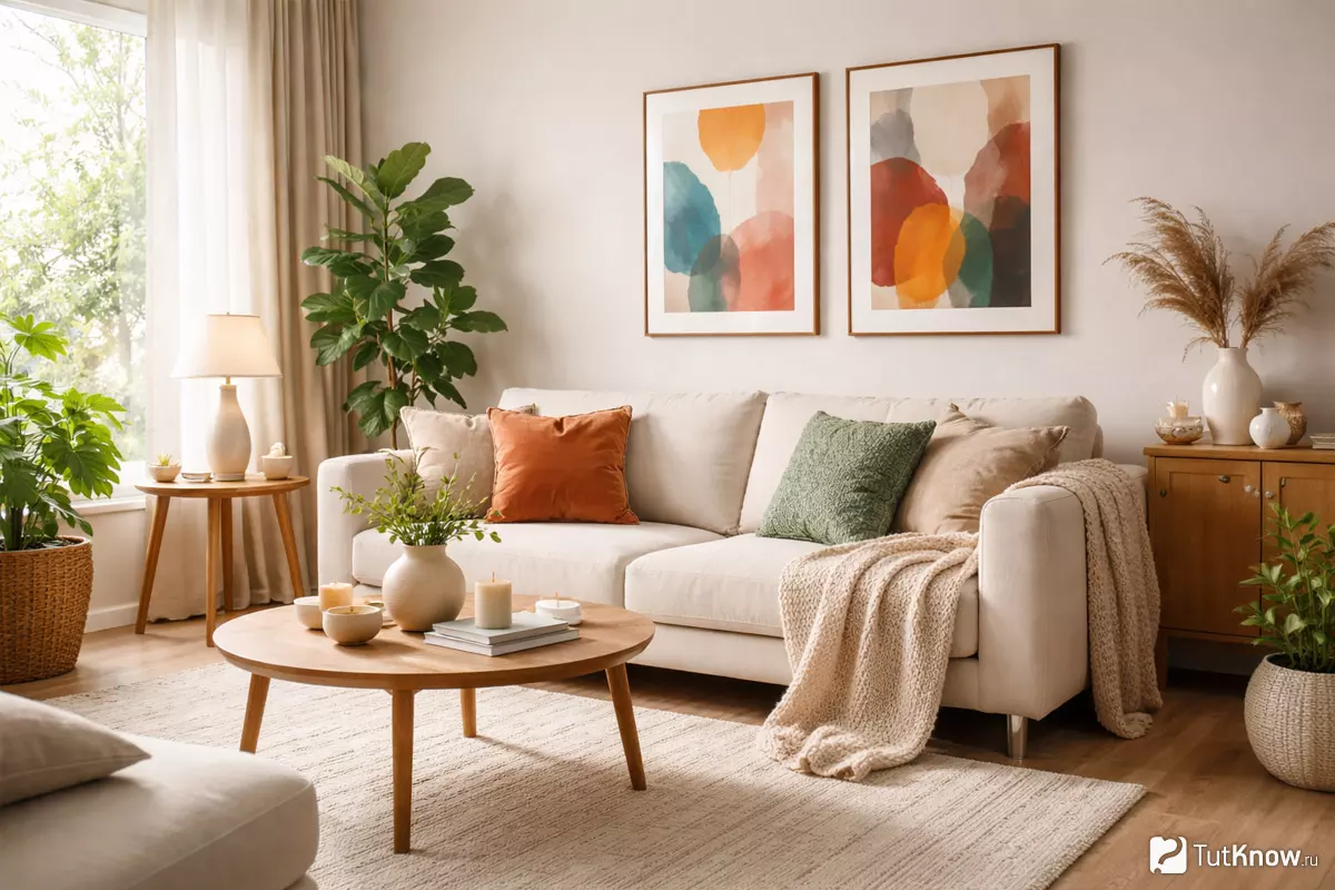 | Декоративные подушки | Добавляют цвет и текстуру, легко менять по сезону | 2–3 штуки на диване или кресле |