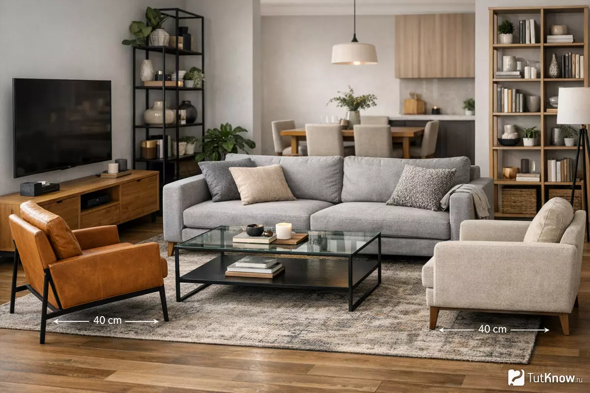 - Расстояние между креслами и диваном — минимум 30–40 см, чтобы не возникало ощущения тесноты.