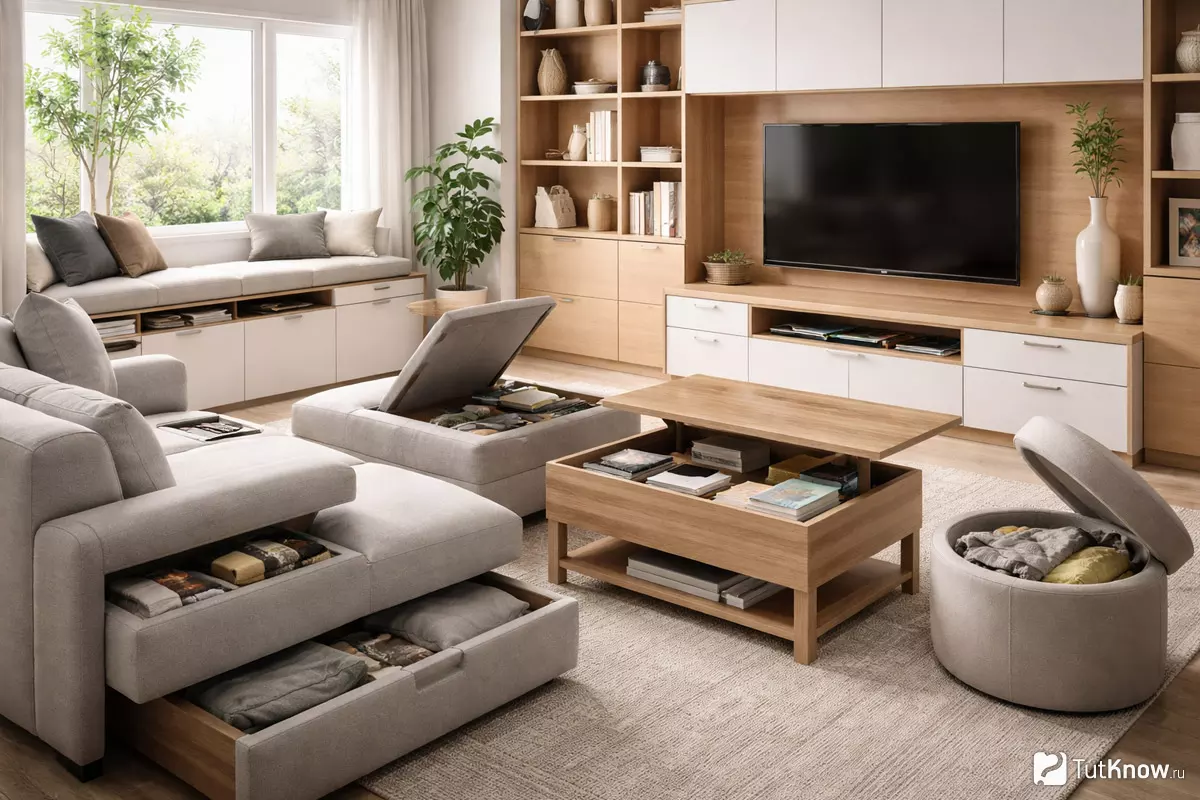 | Журнальный столик | Скрытые ящики, полки под столешницей | Удобно для часто используемых вещей | Ограниченный объем |