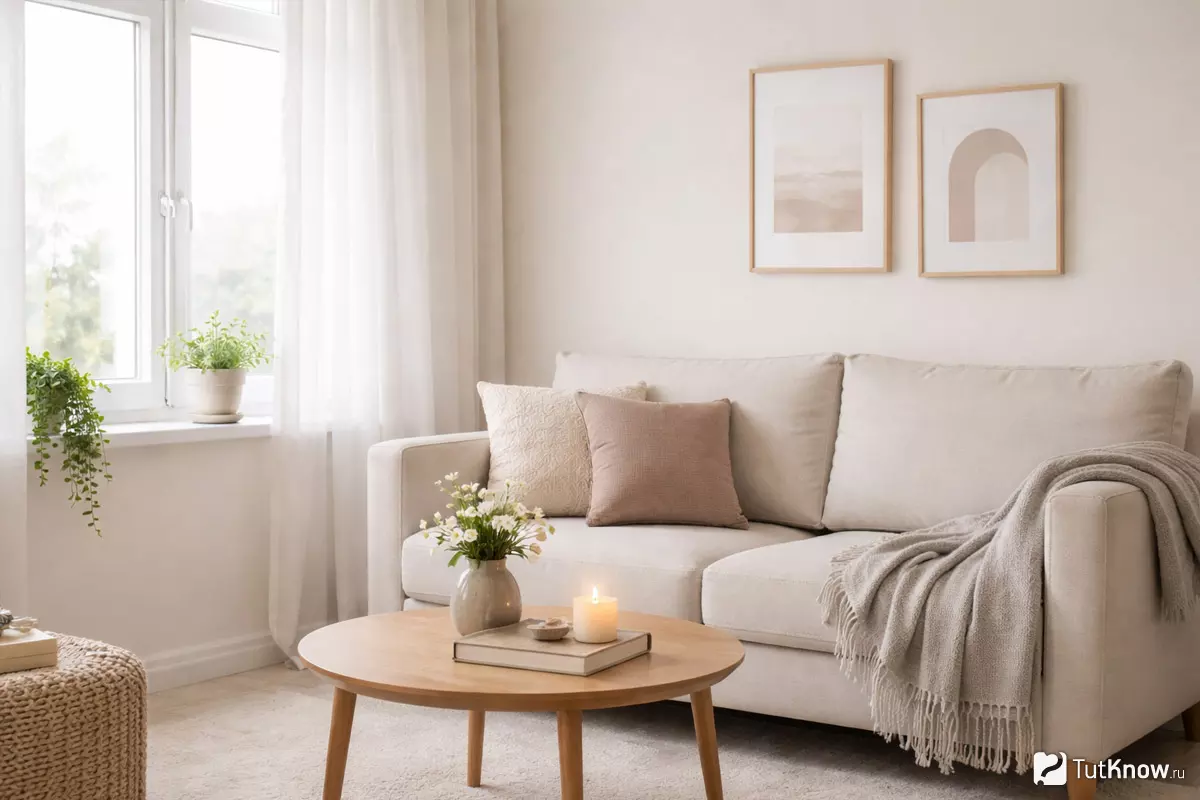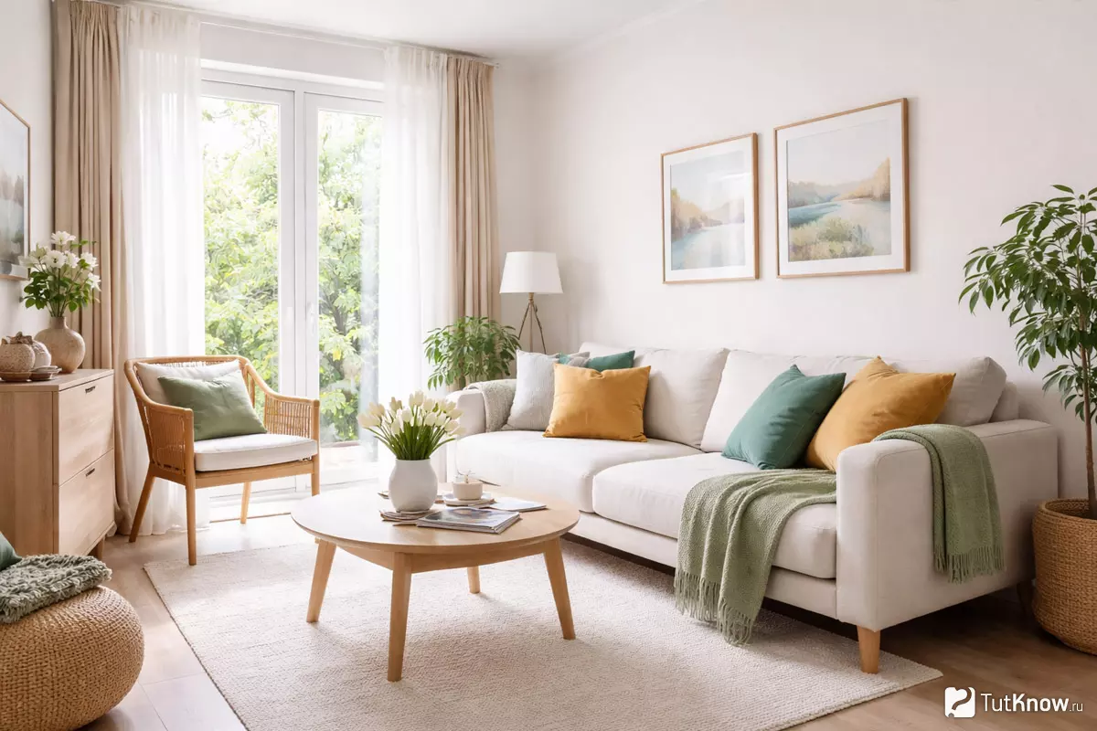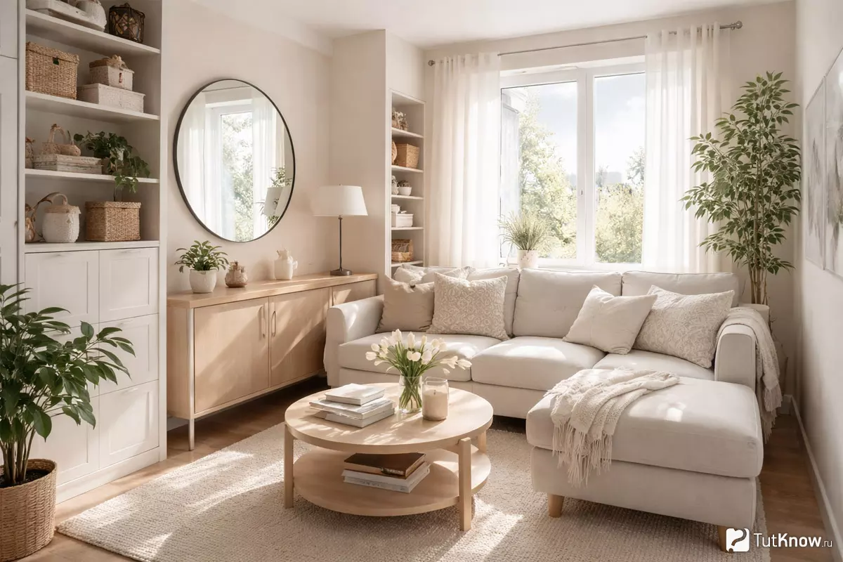 Грамотное распределение светлых тонов и точечные акценты делают даже самую компактную гостиную визуально просторнее и уютнее.