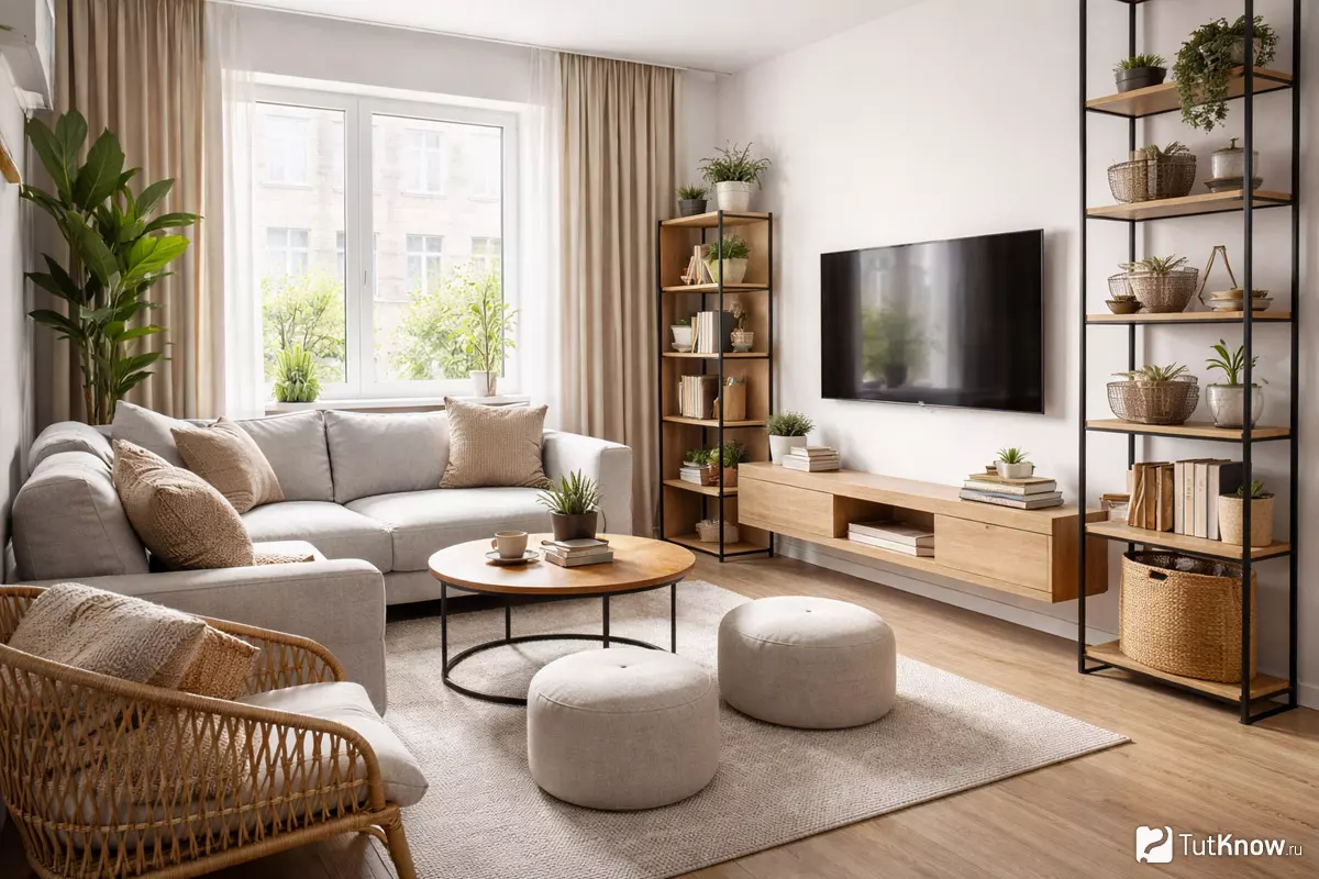 Минимальный набор — диван, журнальный столик, пара компактных кресел или пуфов. Вместо громоздких стенок — открытые стеллажи, которые пропускают свет и не загромождают комнату. ТВ-зону размещают на самой короткой стене или используют настенное крепление, чтобы не терять полезную площадь.
