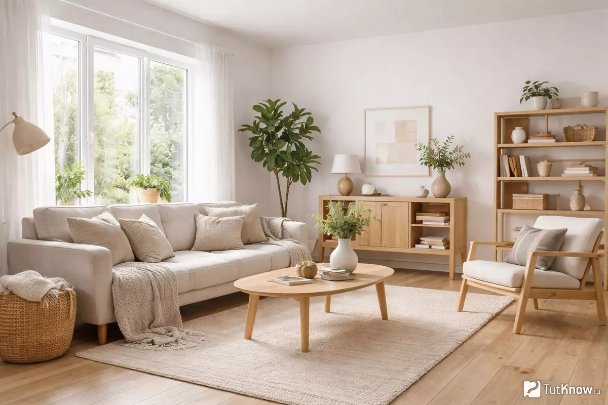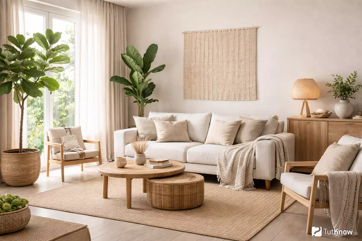 Ощущение уюта и гармонии достигается не только за счёт материалов, но и благодаря деталям: комнатные растения, плетёные корзины, шерстяные пледы, натуральные ковры. Освещение — мягкое, тёплое, часто используются лампы из дерева или бумаги.