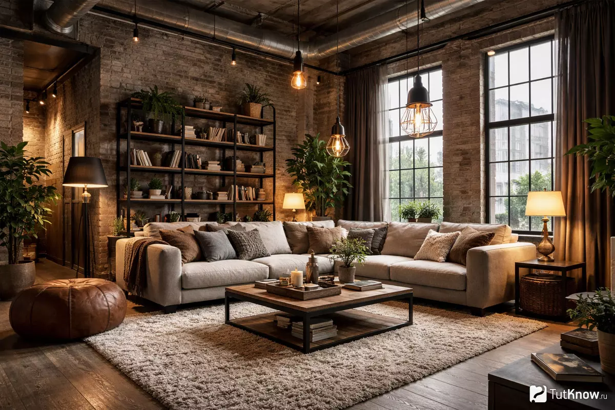 Грубые стены, открытые коммуникации и высокие потолки легко превращают пространство в «склад», если не учесть нюансы. Чтобы гостиная в индустриальном стиле не казалась незавершённой и необжитой, важно добавить уютные детали и грамотно расставить акценты.