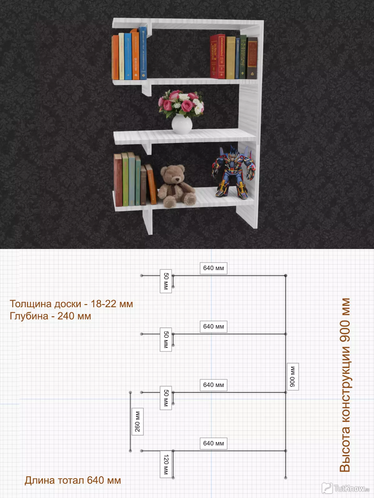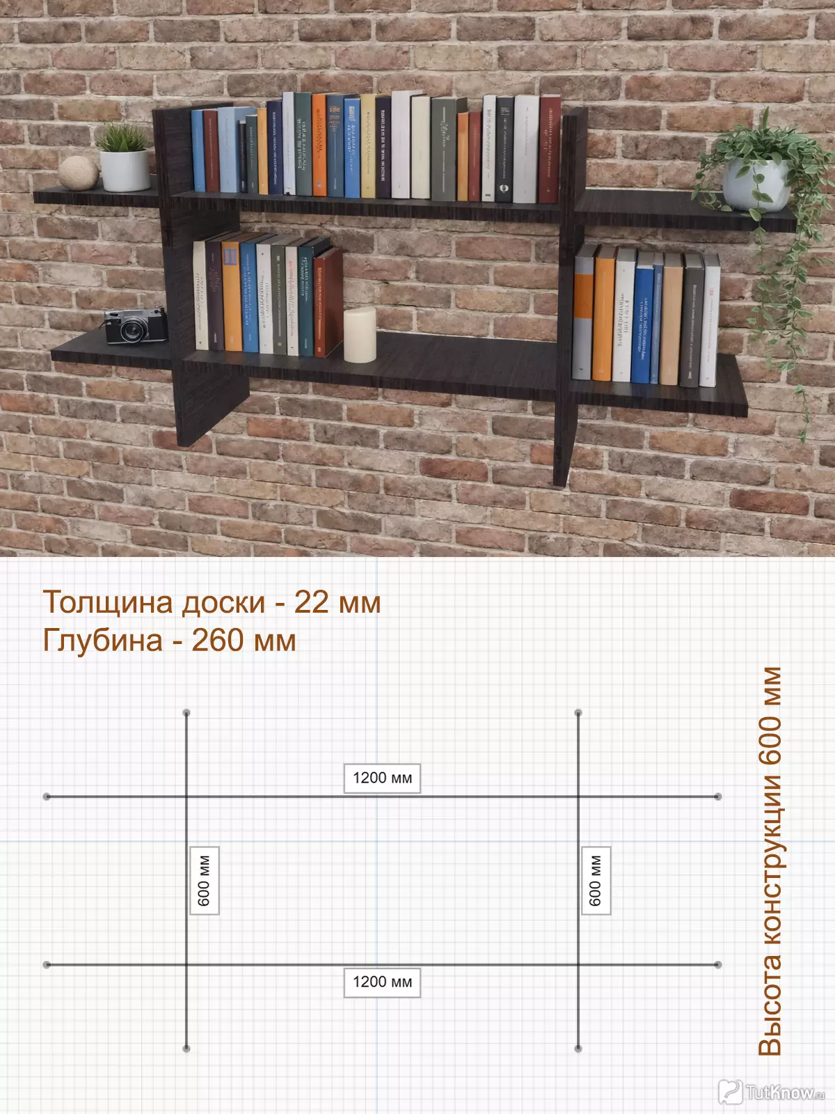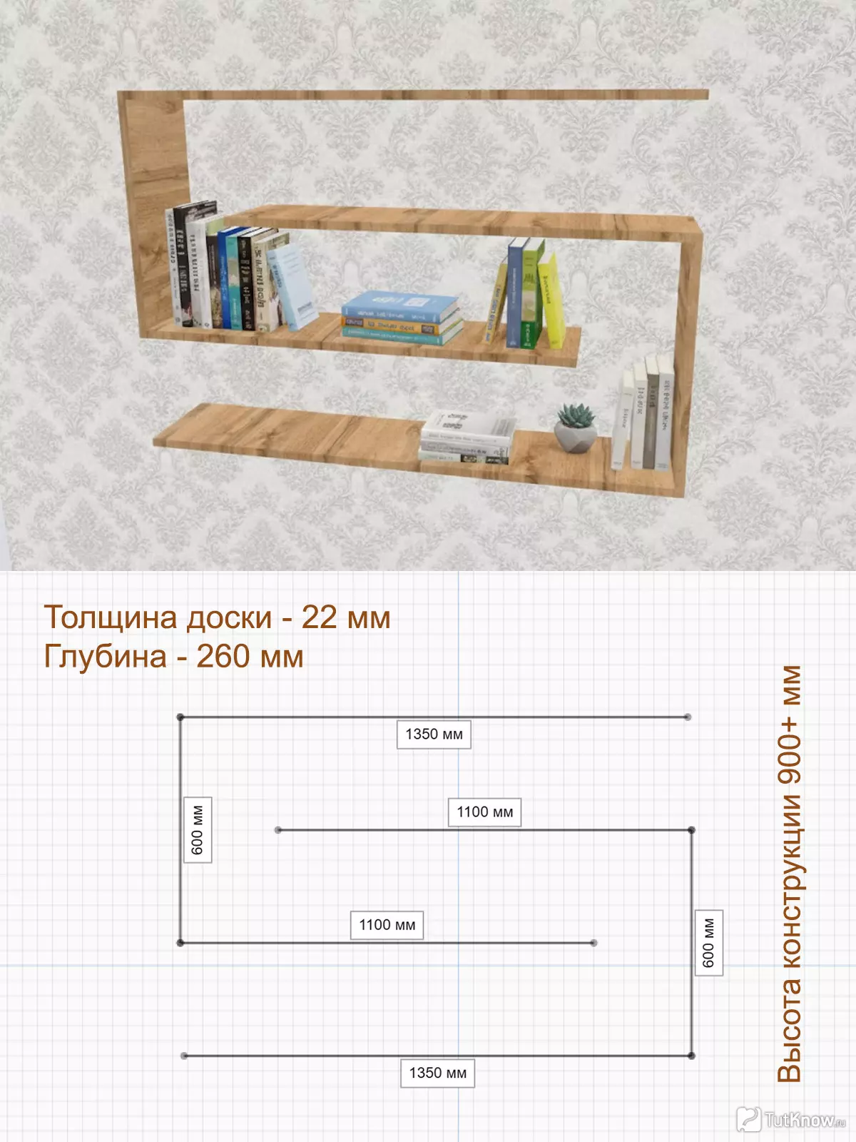 Из-за увеличенных пролётов и выноса крайних частей использование доски менее 22 мм не рекомендуется. Полка рассчитана на книги среднего и большого формата.