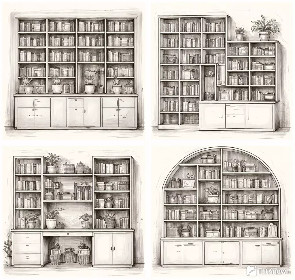 Сборку книжной полки следует выполнять строго по чертежу, без импровизаций по размерам. Это особенно важно для секционных и асимметричных конструкций, где любая ошибка приводит к перекосу.