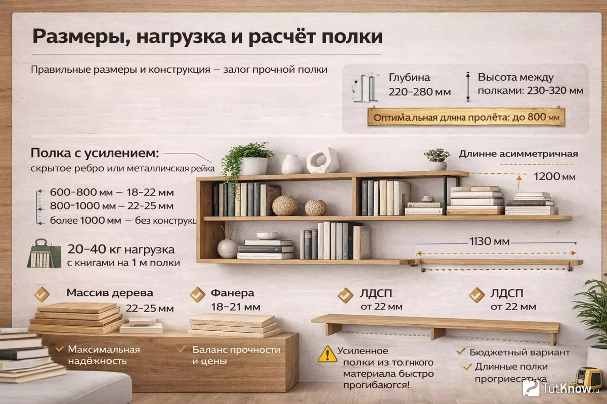 Правильный расчёт размеров напрямую влияет на срок службы мебели. Основная ошибка — попытка сделать длинную полку из тонкого материала без усиления.