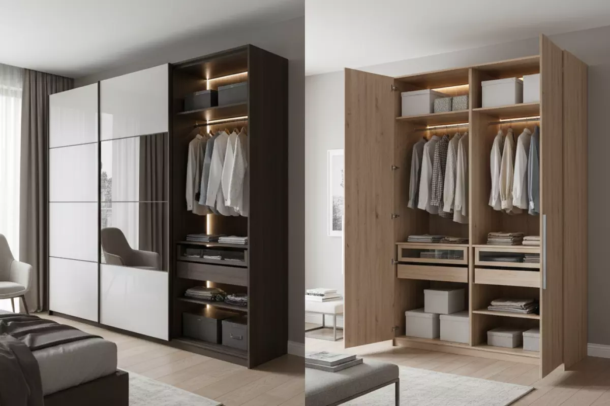 По объёму хранения обе конструкции можно сделать очень похожими, но в реальной жизни разница чаще упирается в то, как вы пользуетесь дверями и насколько удобно доставать вещи каждый день. У одной модели проще «открыть всё и сразу», у другой — выиграть место перед фасадом и не упираться в распах.