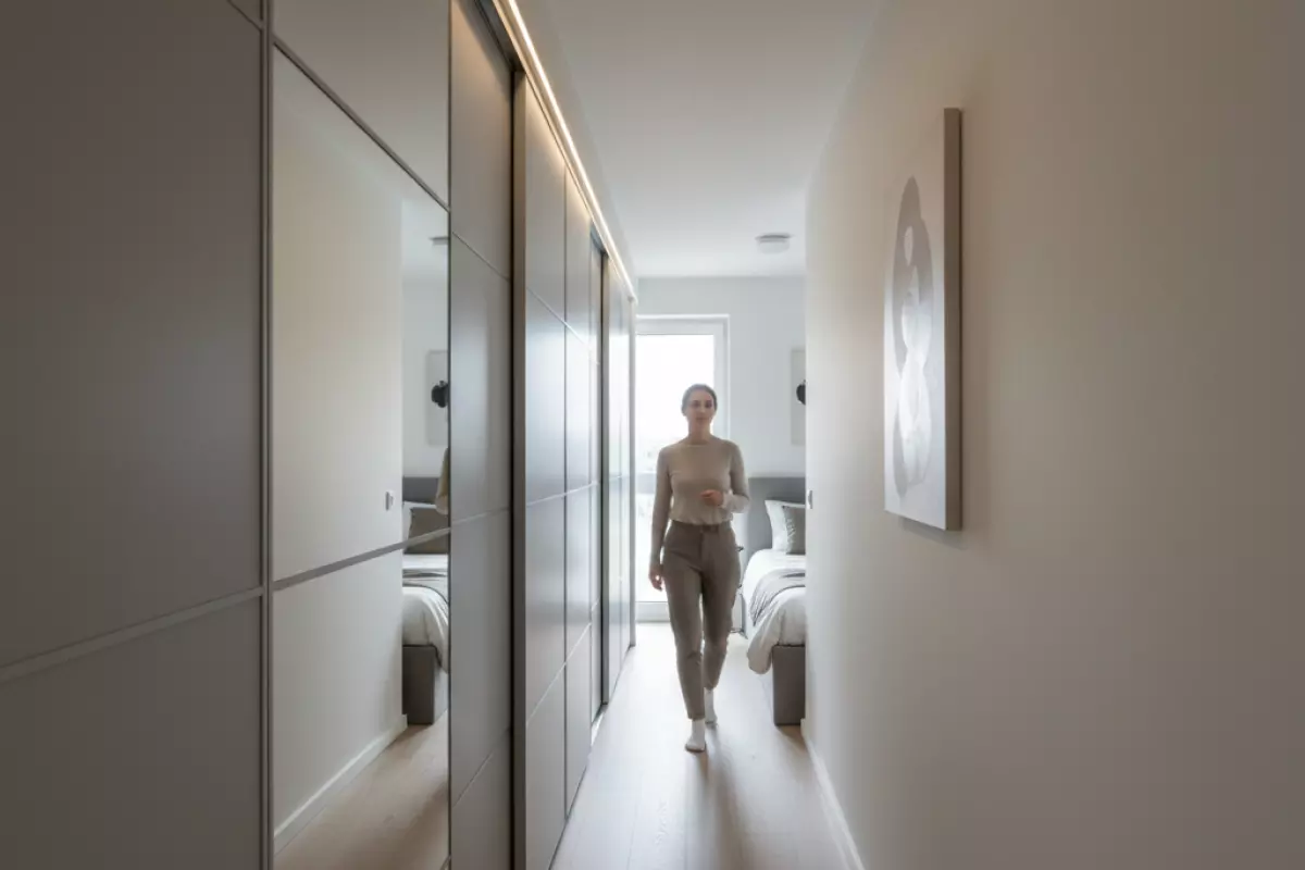 Раздвижные двери часто выигрывают за счет цельного фронта: меньше выступающих элементов, проще сделать фасад «как стена». В узких коридорах это особенно заметно — нет ощущения, что мебель «лезет» в проход.
