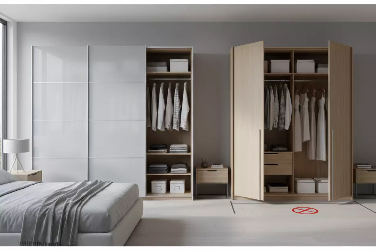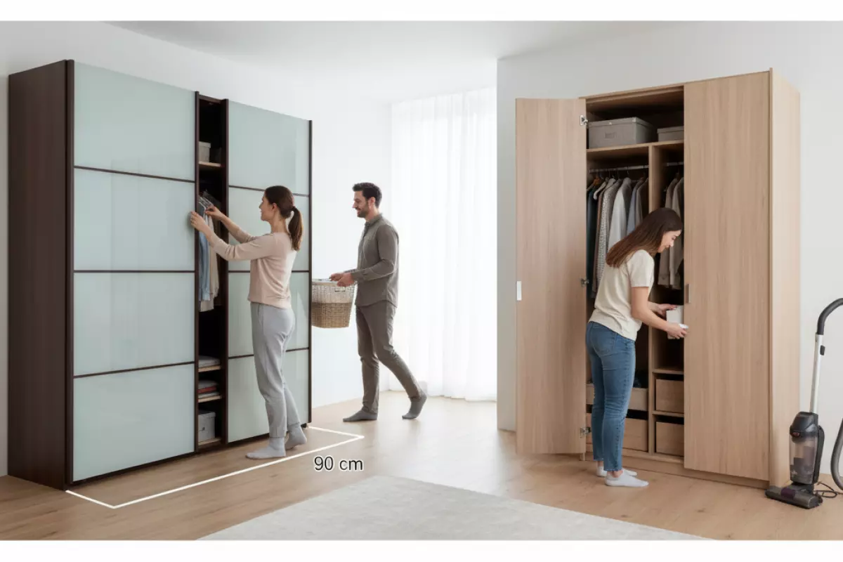 Сначала прикиньте, сколько «живого» пространства должно оставаться перед фасадом, чтобы было удобно подходить, доставать вещи и не цепляться за мебель. Разница между раздвижными и распашными дверями чаще всего упирается не в внешний вид, а в то, как именно используется проход перед шкафом.