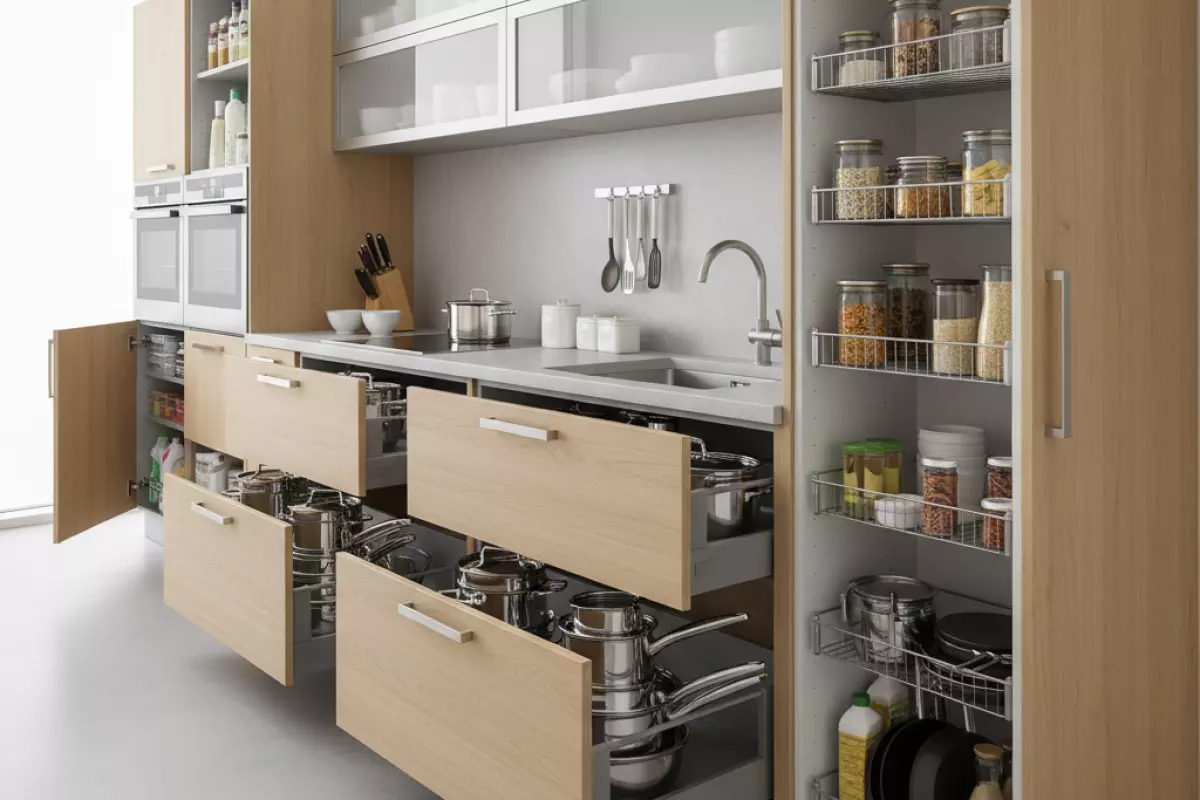 | Кастрюли, сковороды, крышки | Широкие выдвижные ящики или глубокий выкатной модуль | Внизу рядом с варочной | Нагрузка на направляющие, удобство разделителей под крышки |