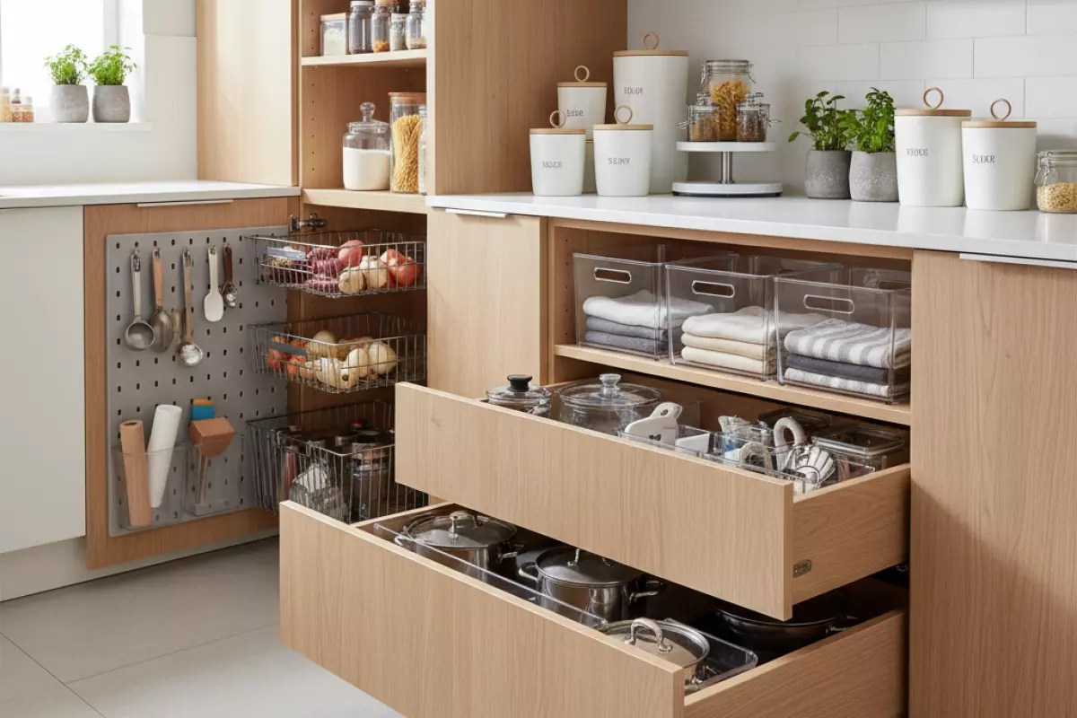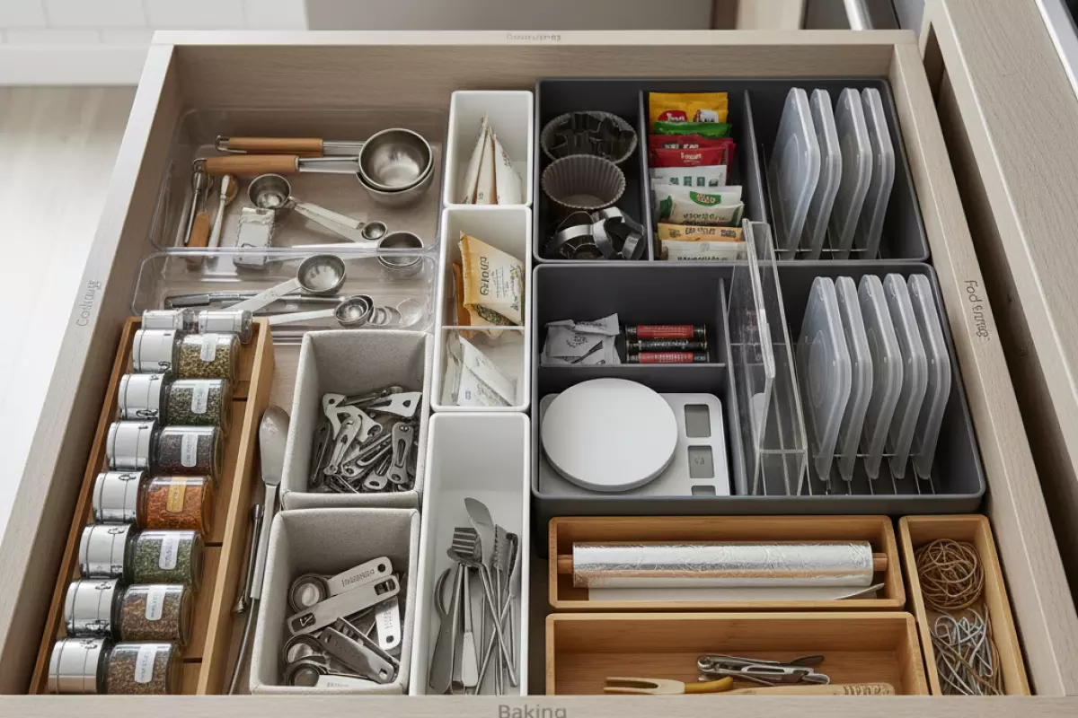 Ключевые мелочи — пакеты, фольга, пергамент, резинки, зажимы, батарейки для весов — чаще всего «кочуют» по кухне. Без выделенного ящика они создают визуальный шум и постоянно теряются.