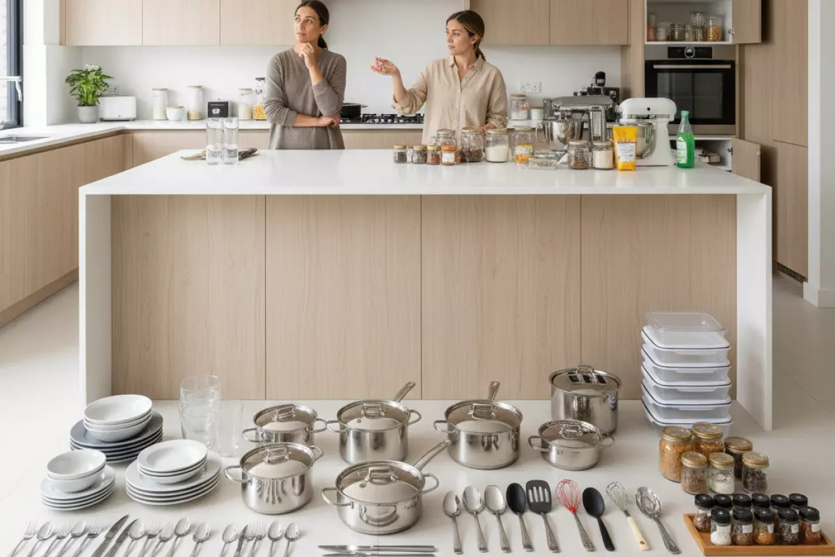 Сначала разложите все кухонные вещи по группам прямо на столе или полу: посуда, приборы, кастрюли, запасы, специи, техника, контейнеры, бытовая химия. Так быстро видно дубли (например, пять одинаковых лопаток) и то, что давно не используется. Лишнее проще убрать до того, как вы начнёте «распихивать» всё по полкам.