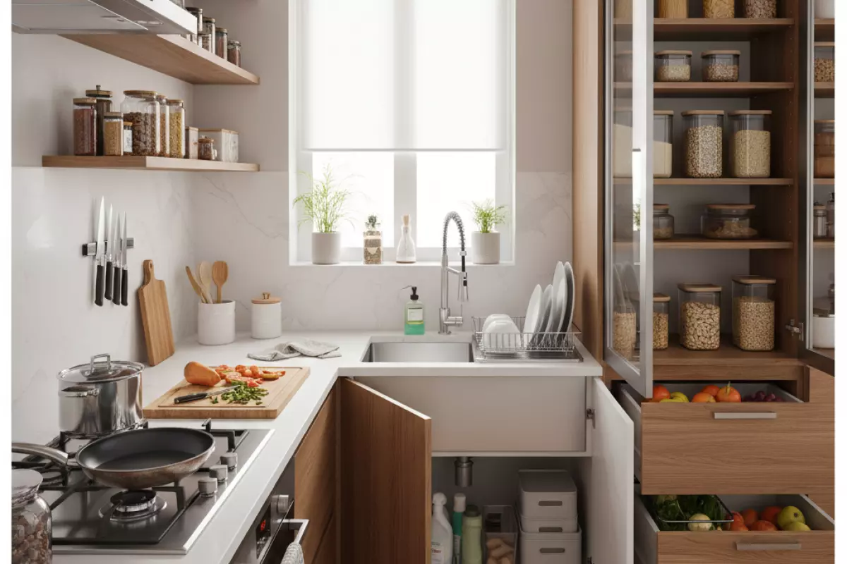 - Редко используемое (праздничная посуда, большие формы) уберите в дальние зоны или в угол, а не в «золотые» ящики у рабочей поверхности.