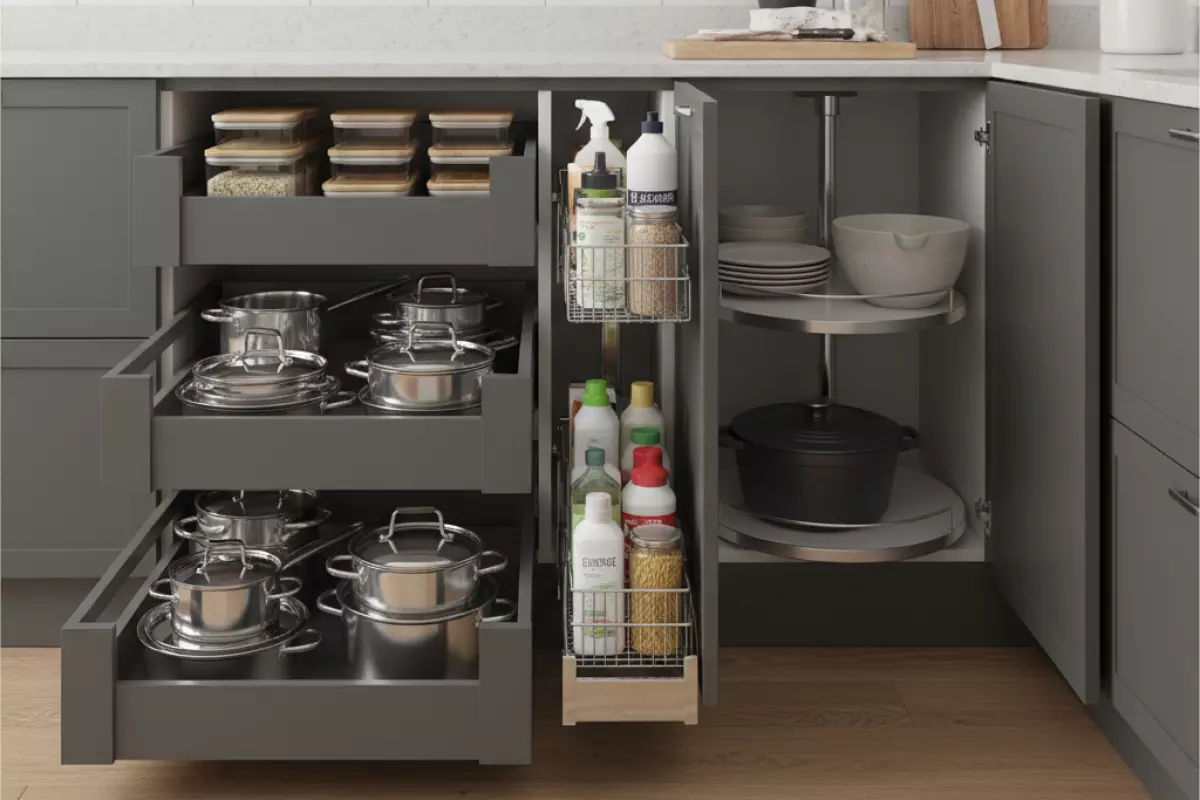 - Выдвижные системы типа «волшебный уголок» — содержимое «выезжает» наружу, меньше наклонов и поиска.