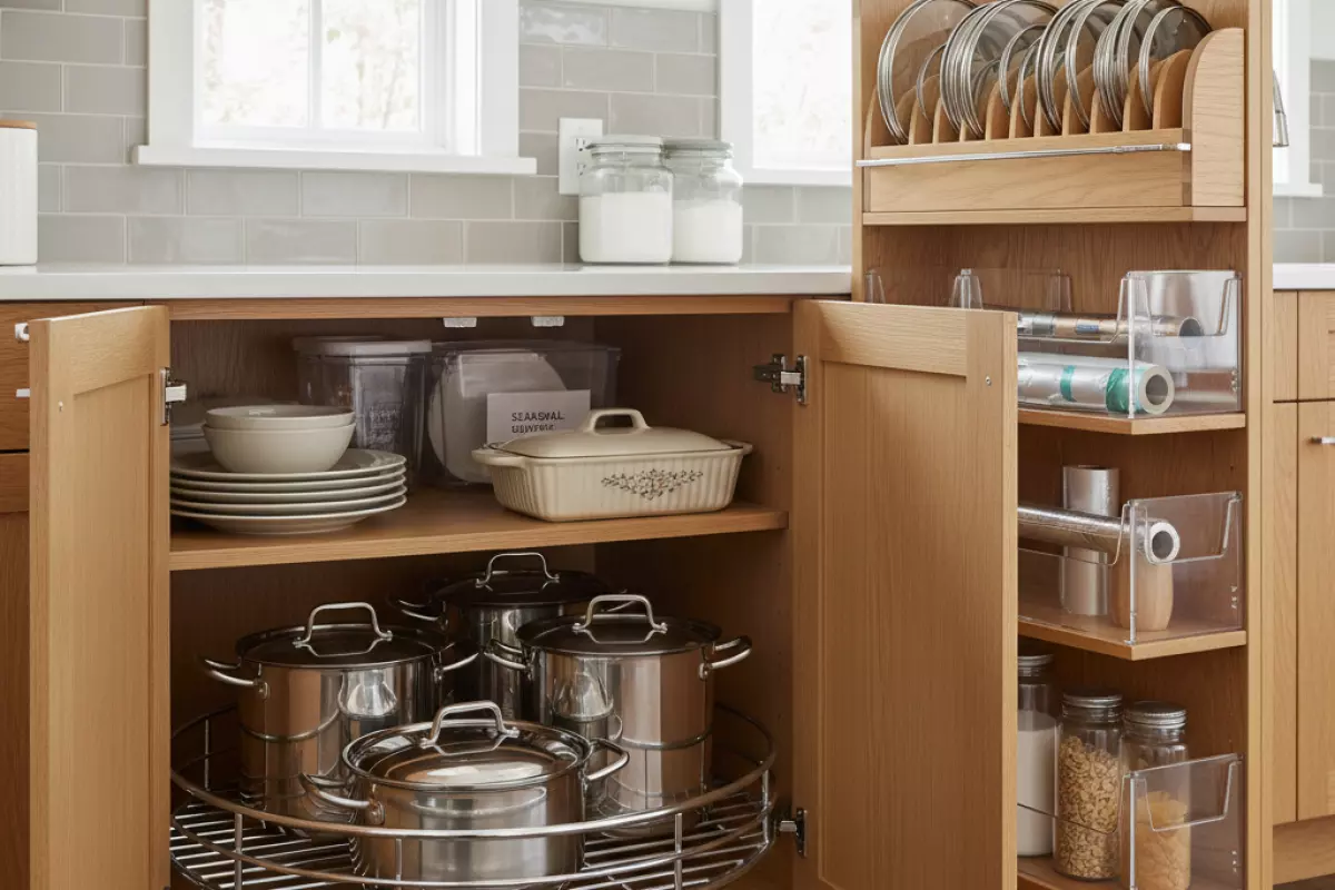 Используй углы и дальние отсеки как «зоны редкого доступа»: туда логично убирать то, что не нужно каждый день. Тогда не придется каждый раз вынимать половину содержимого, чтобы достать одну форму или кастрюлю.