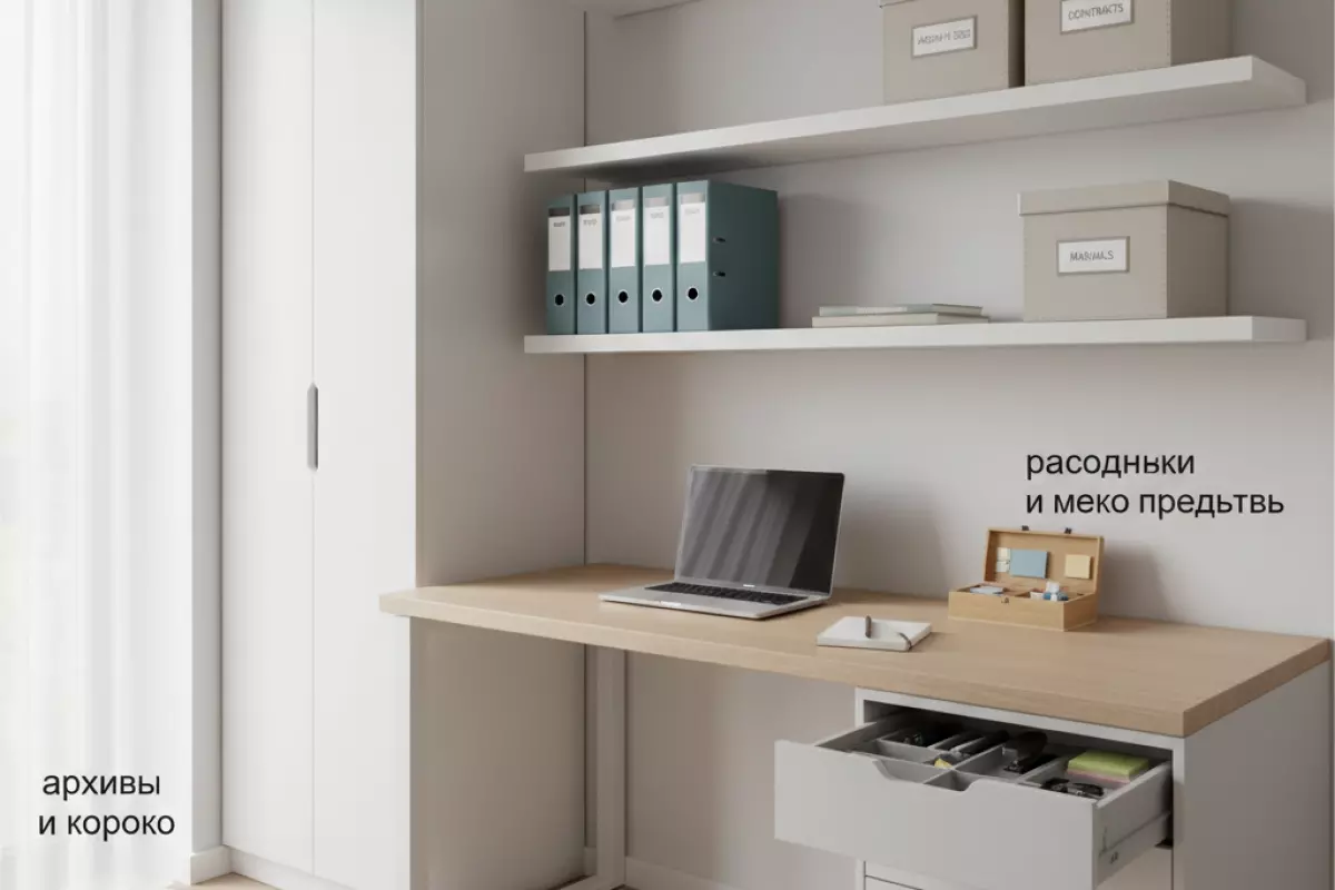 | Текущие бумаги | Лоток на столе или верхняя полка надстройки | 1–2 тонкие папки, без толстых стопок | «В работе», дата или проект |